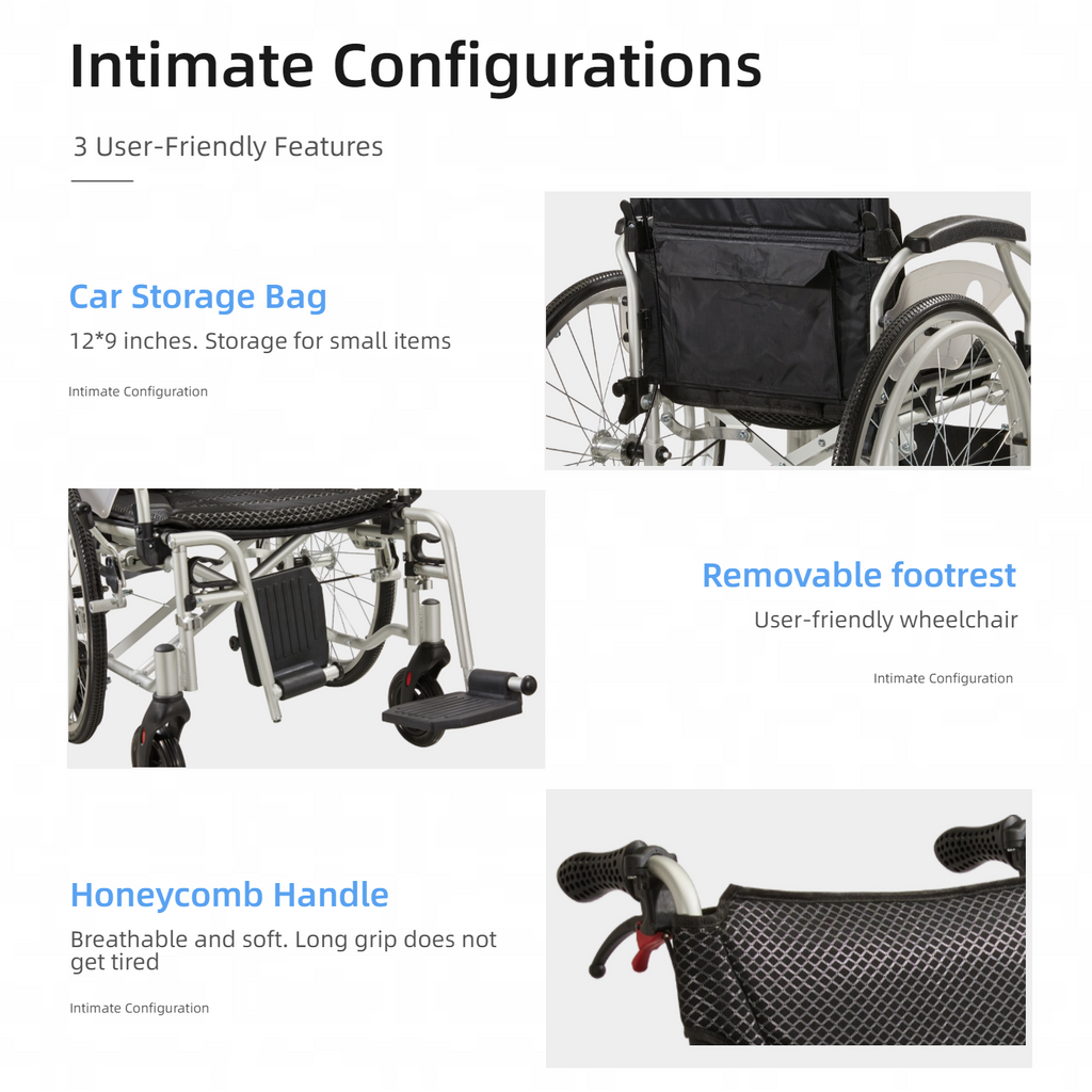 • 【Lightweight Wheelchair】 Seat width 18' .Body weight is 31 lbs, 4 small wheel mode is only 25 lbs. Equipped with 12' W x 8.5' H storage bag, convenient for storing your belongings.24' PU rear wheels and 6' universal wheels to easily navigate different road surfaces