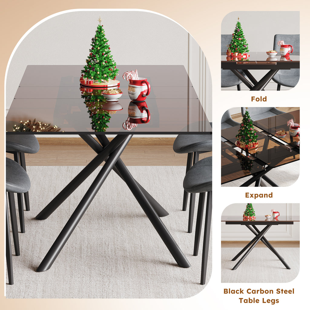 59-inch Expandable Dining Table Set with 4 Gray Ergonomic Chairs, Black Sandblasted Glass Top & X-Base, 4-8 Seater Modern Dining Set for Small Spaces, Kitchen and Apartment