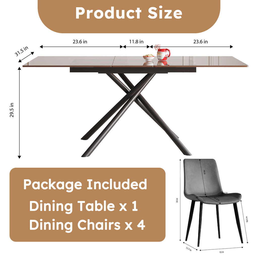 • Complete 5-Piece Modern Dining Set:This stylish 5-piece dining set combines our 59-inch expandable table with four matching gray ergonomic chairs. The sleek black sandblasted glass top pairs perfectly with the minimalist X-base and contemporary gray chairs, creating a cohesive modern aesthetic that elevates any dining space, kitchen, or apartment.