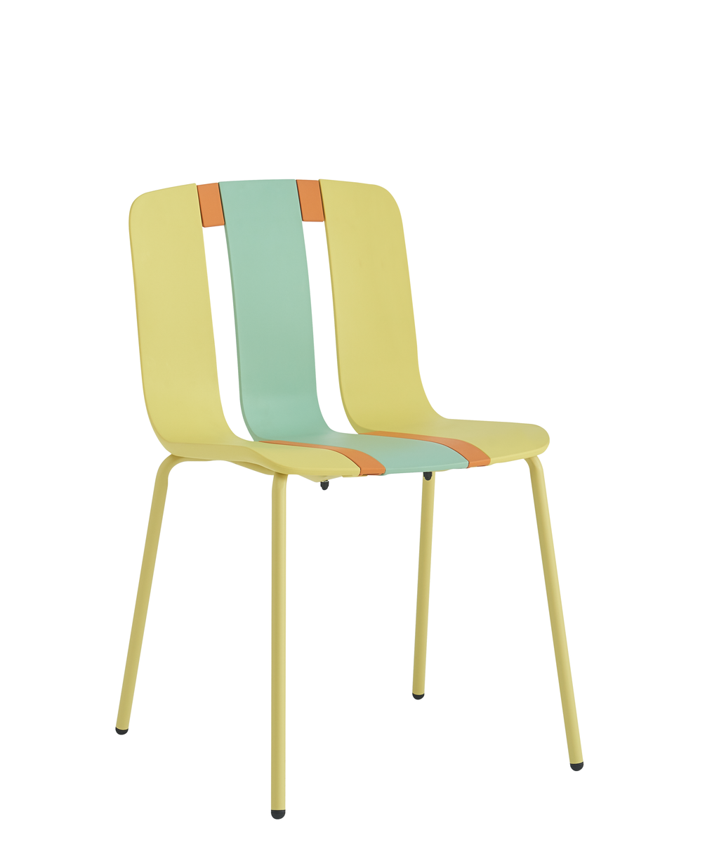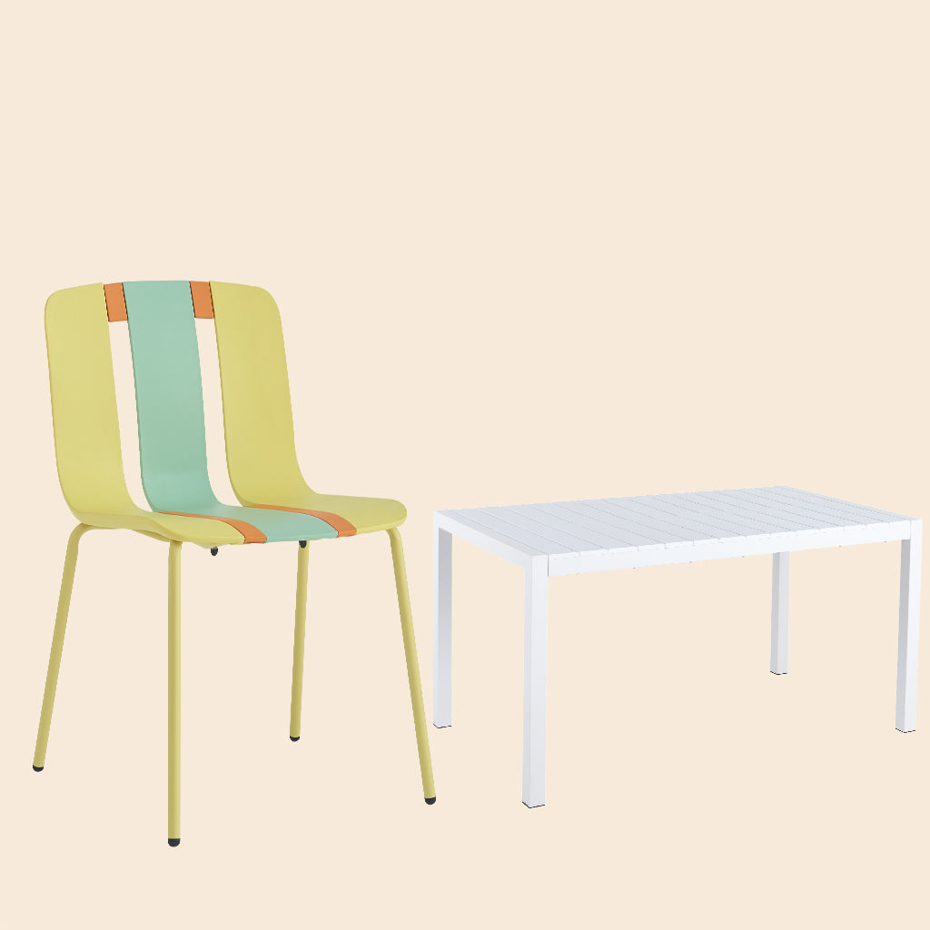 4-Pack Modern Striped Color Block Chairs-Indoor/Outdoor PP Seat & Sturdy Metal Legs, Yellow, Orange, Green with 55 Inch White Modern Long Table - Indoor/Outdoor- Lightweight PP Tabletop with Metal