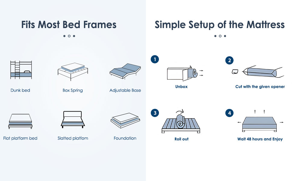 • The mattress is compressed, rolled up and packed into a single box for easy delivery. It is compatible with most bed frames, or can even be placed directly on the floor. Please wait 24-72 hours after unpacking to ensure its fully expansion and optimal performance.