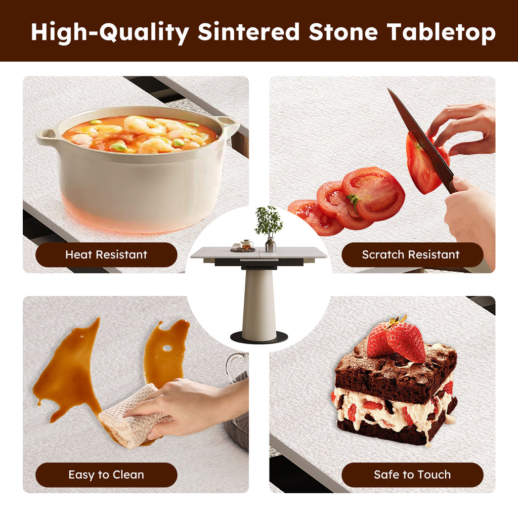 • Premium Retractable Rock Slab Table with Modern Functionality:This innovative dining table features a durable rock slab surface and smooth retractable mechanism that effortlessly adjusts to accommodate varying needs. The combination of industrial-grade materials and intelligent design creates a centerpiece that balances aesthetics with practical daily use.