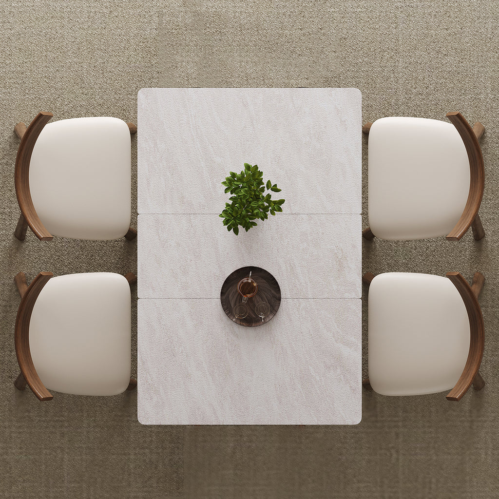 Retractable Rock Slab Dining Table Set, Modern 5-Piece Expandable Table with 4 Wooden Leg Chairs & Leather-Wrapped Base, Space Saving Kitchen Set for Small Apartments