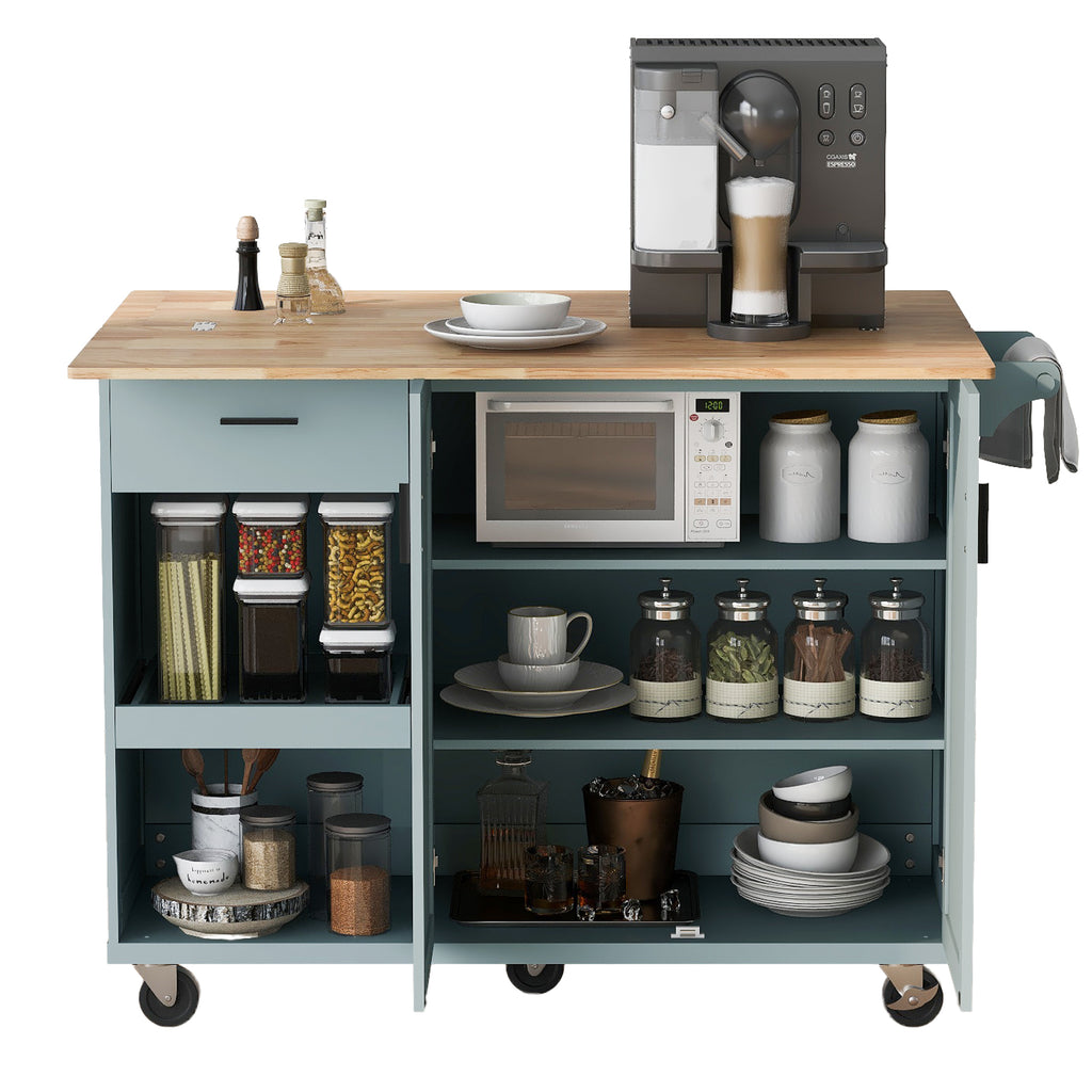 K&K Kitchen Island with Foldable Counter Top, Kitchen Storage Cart with Slide-Out Shelf, Towel Rack and Drawer, Rolling Kitchen Cart on Wheels, for Kitchen, Living Room, Dining Room, Grey Blue