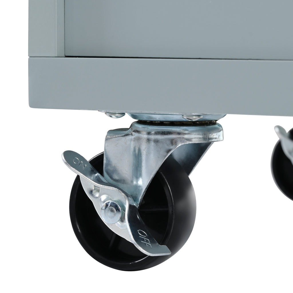 This mobile kitchen island on wheels is equipped with five wheels that rotate and move in all directions, two of which are lockable.