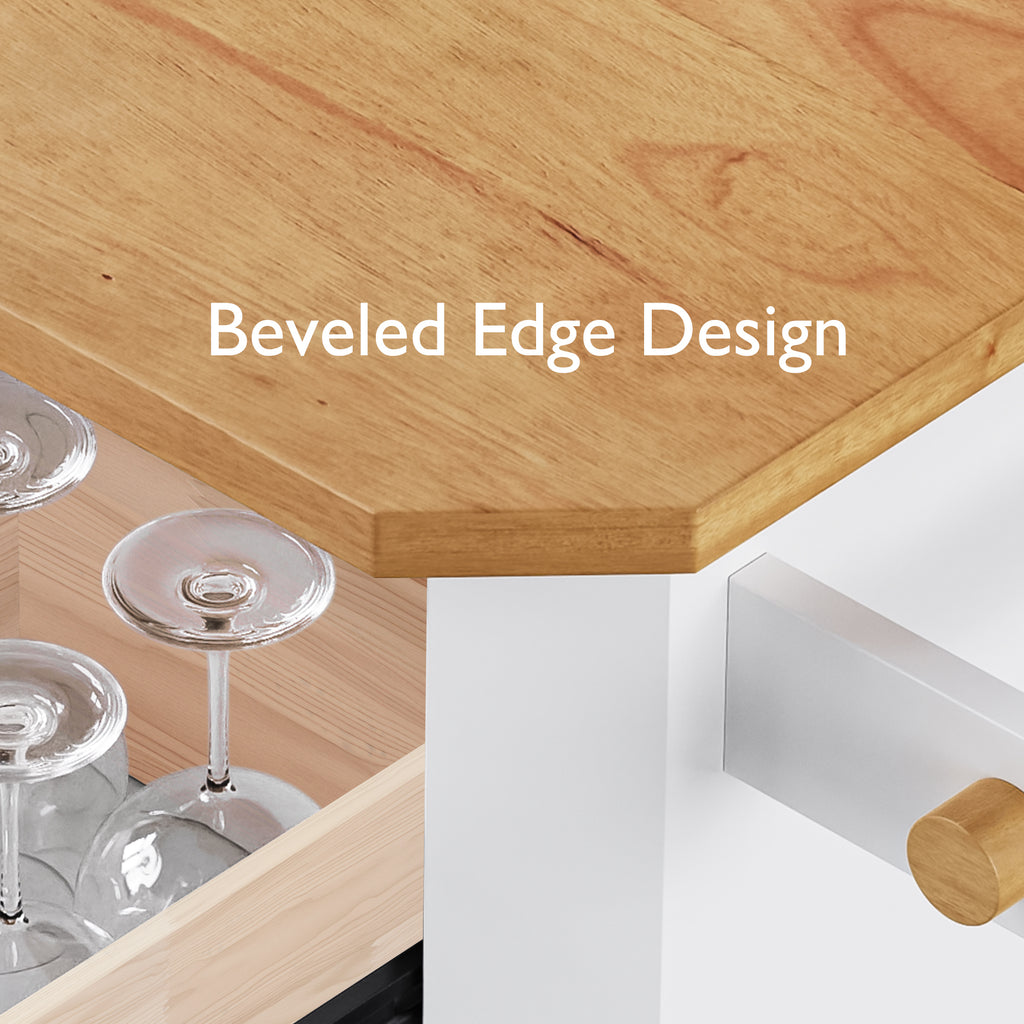 • [Moveable & Stationary kitchen island] This mobile kitchen island is equipped with four concealed lockable wheels at the bottom. Unlike other products that prioritize appearance over functionality, users can easily access and adjust the wheel position to secure them in place. The option to forgo the installation of wheels is available if mobility is not required, as the cabinet's sturdy base provides ample support for up to 300lbs without any instability.