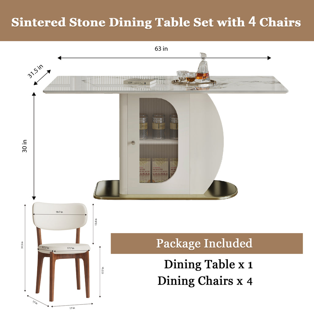 Modern 63' 4-6 Person Dining Table Set with Storage, Burnt Stone Top & Gold Solid Wood Base, Includes 4 White PU Chairs for Kitchen, Apartment