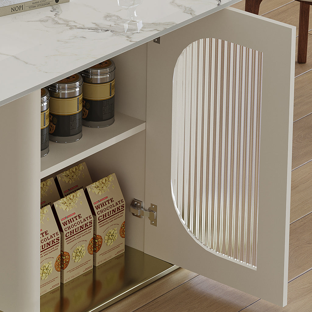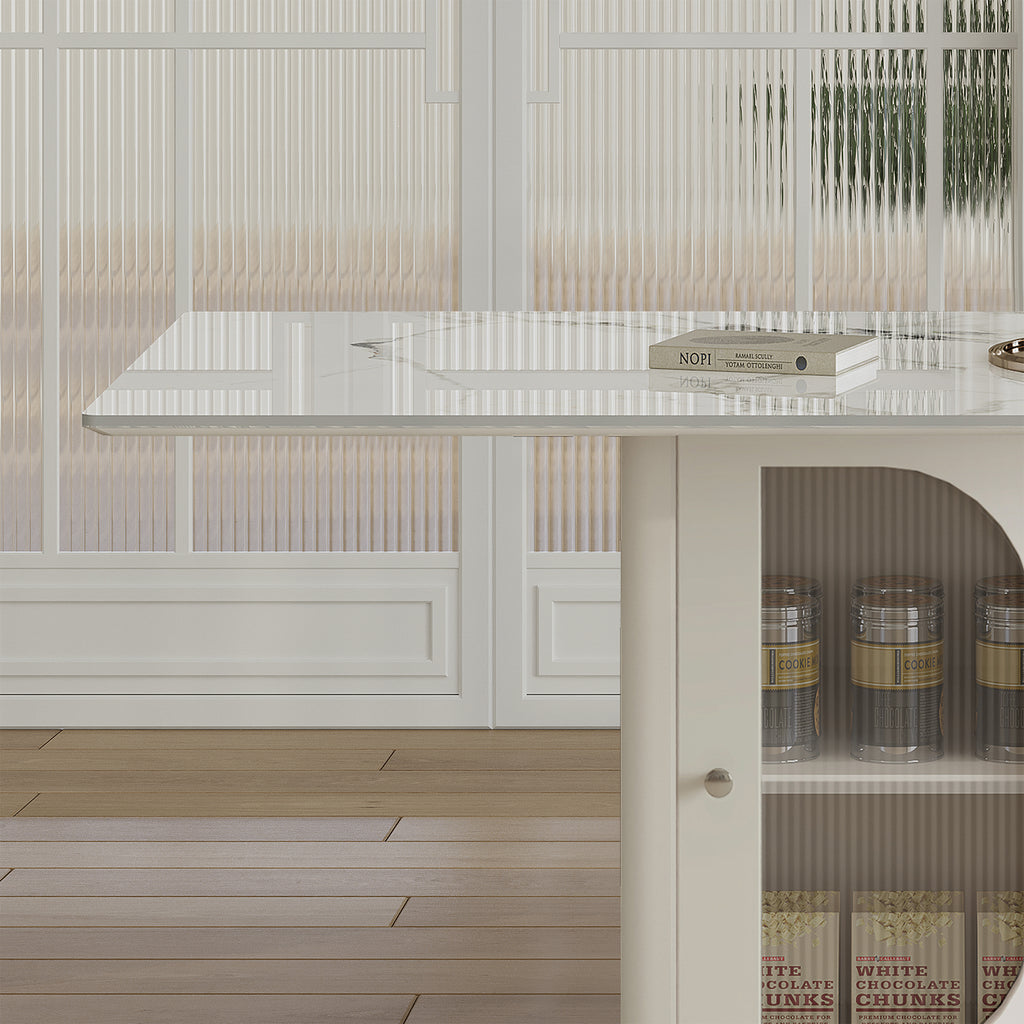 • SMART STORAGE SOLUTION: The built-in side storage racks and transparent glass cabinets provide convenient space for storing essential items for meals.