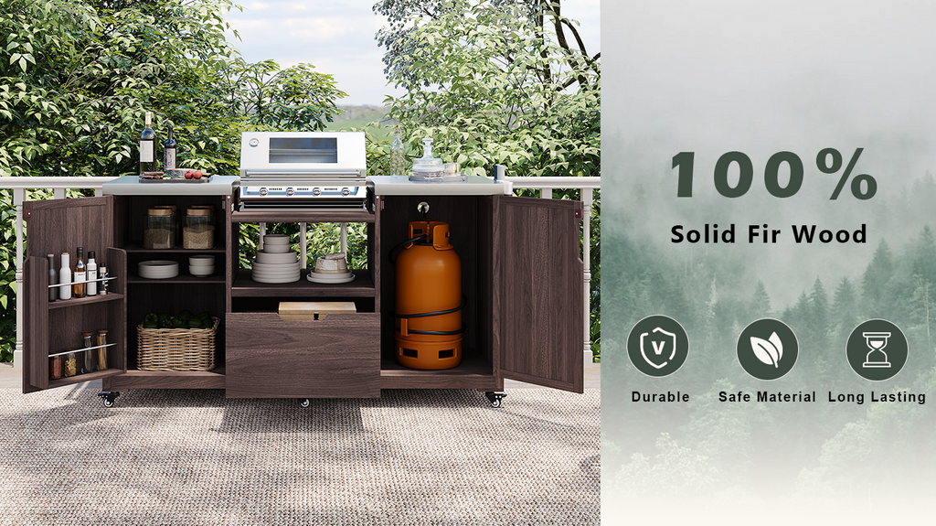 Highlights | [Ample Storage Space][Big Green EGG Grill][Tabletop Grill Stand] [Removable Middle Front Stop Stickers][Large Solid Wood Drawer][Kamado Joe Grill Stand] [1.2' Thick 201 Stainless Steel Top][Internal Storage Racks][6*360°Smooth Lockable Rubber Wheels][Weatherproof] [Premium Fir Wood][Removable& Adjustable Shelf][Spice Rack] [Large Towel Rack][Modular Towel&Paper Rack][ 5 'S' Hook Hanger] [Bottle Opener][Gas Line Hole ][Open Shelf in the Middle] |