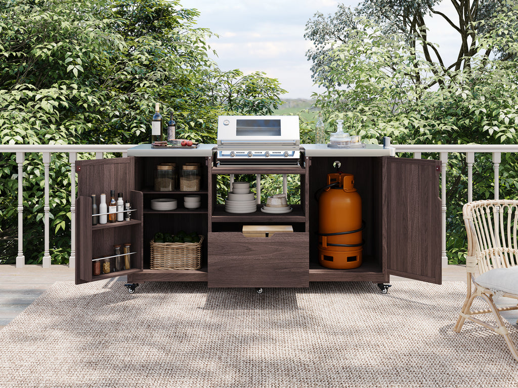 - [Ample Storage & Grill Space] The outdoor grill cart features a spacious central drawer, two cabinets and two 18.5” x 23” stainless steel tables at each end. By placing the middle adjustable shelf on top, you can connect them to create a large 60” x 23” table with a total work area of 1380 sq inches, ideal for any outdoor use. If you wish to utilize a gas grill on top and store a gas cylinder within the full cabinet, you can safely route the gas line through the exit hole for an optimal setup.