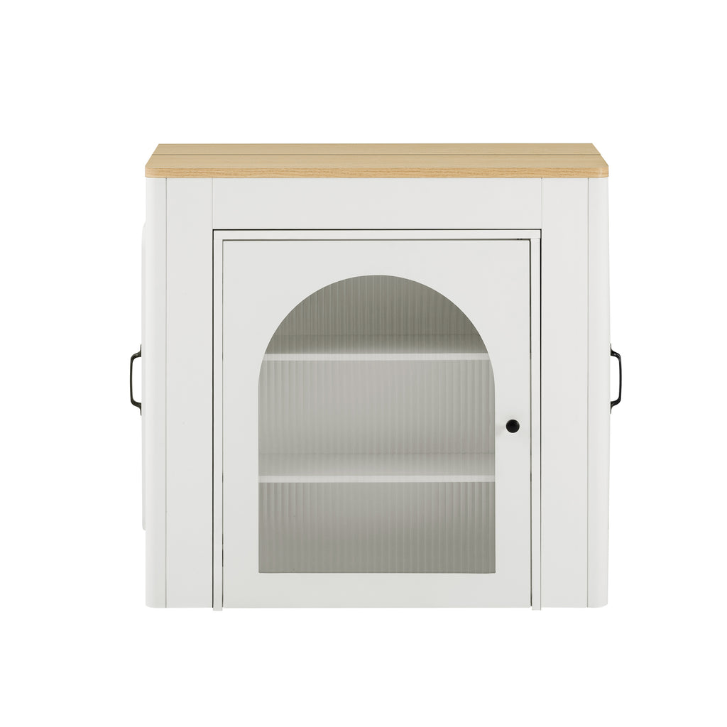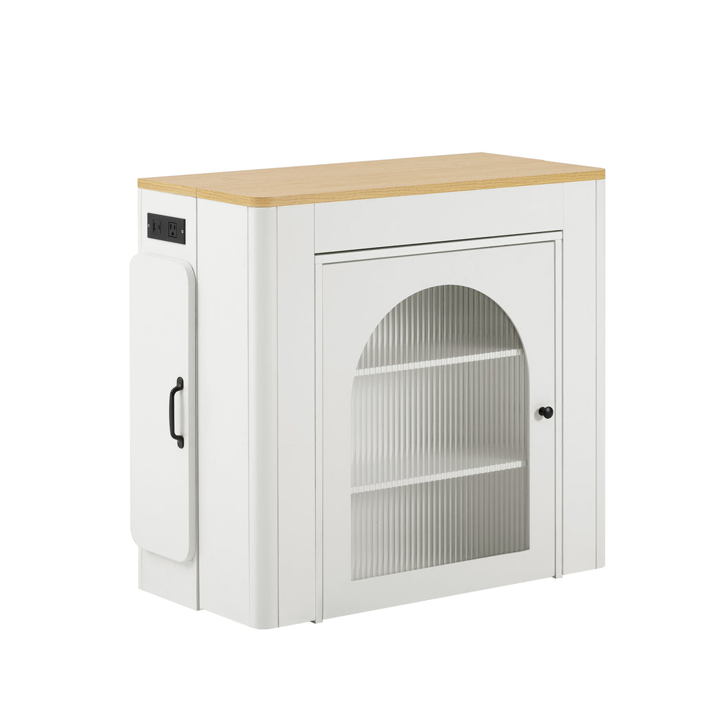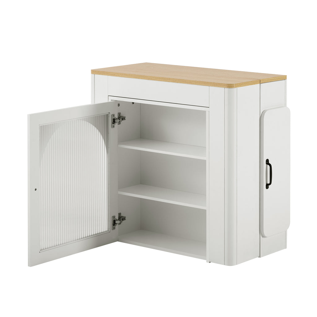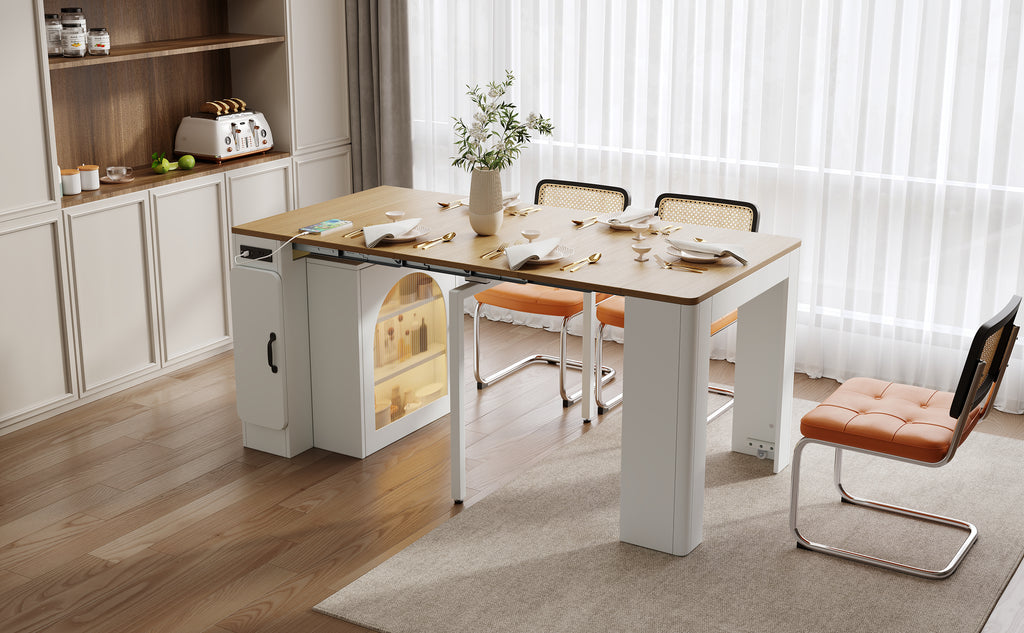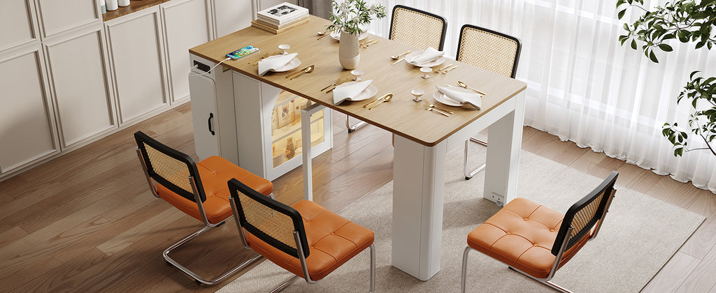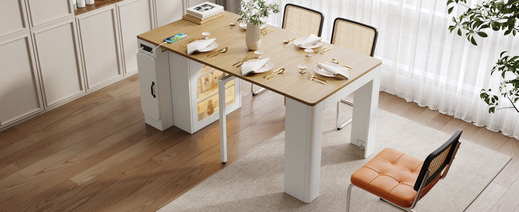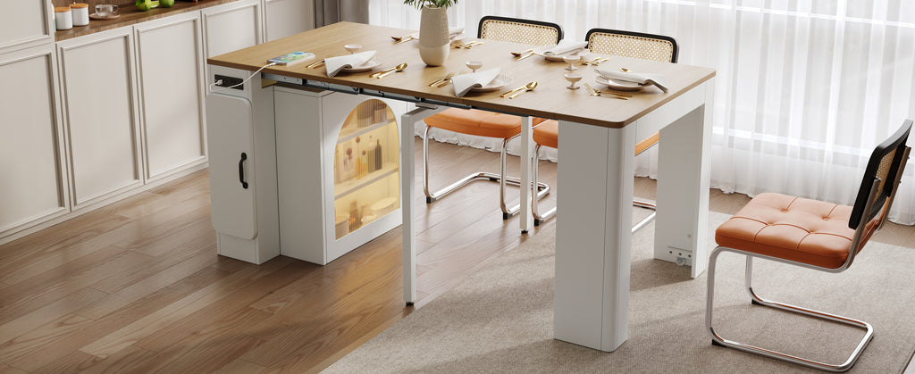 - Timeless Modern Aesthetics: This modern extendable dining table features a striking visual contrast and creating a minimalist fresh style. Accented with metal handles and arched fluted glass doors, it exudes exquisite craftsmanship. Chamfered round edges soften tabletop corners for a gentler touch, which are people-friendly. This extendable dining table seamlessly complements diverse home styles, functional as a dining table, kitchen island, sideboard, bar table, or display cabinet.