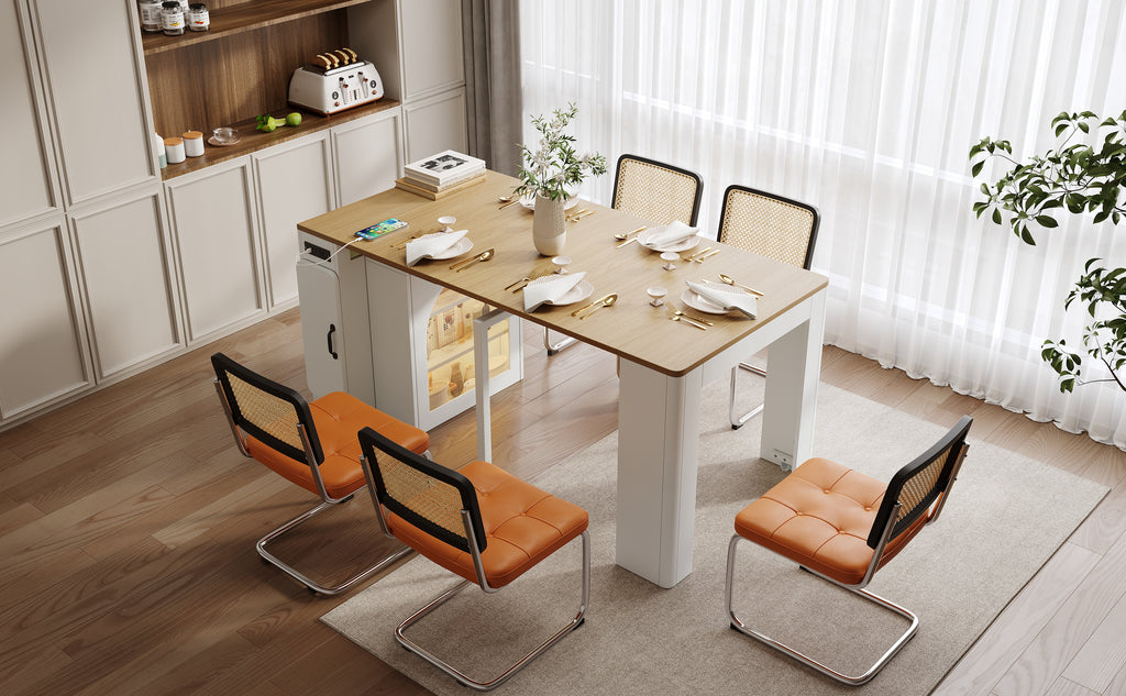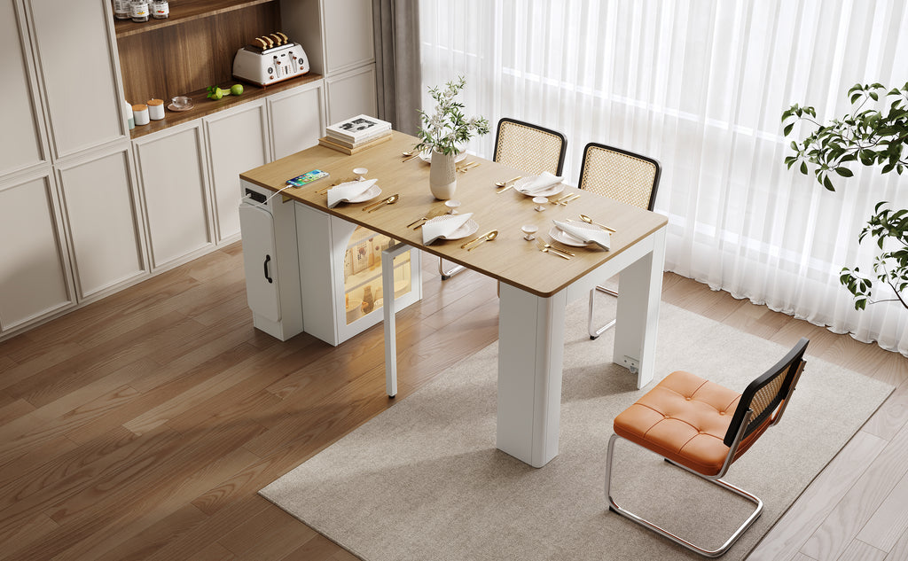 3 removable middle leaves enable free expansion, adapting to diverse needs easily. It comes with hidden smooth-rolling wheels for effortless sliding and duckbill buckles allowing easy opening/closing while stabilizing the structure. Enjoy versatile use: 1 panel for solo time, 2 panels for 2-3 people’s cozy meals, 3 fully extended panels for 4-5 guests’ weekend gatherings. When unused, it turns into a small saving-space sideboard against the wall.