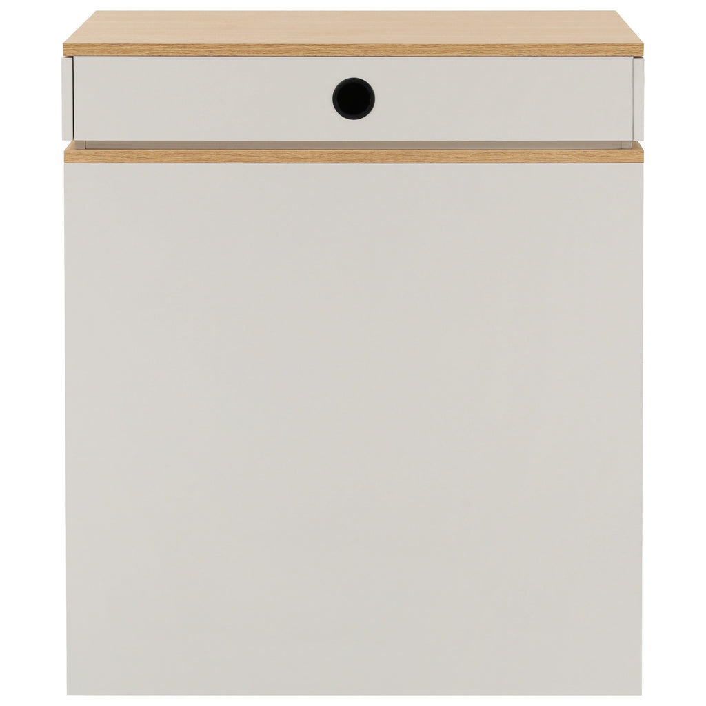 White cabinetry paired with natural wood-toned countertops and a floating design create a minimalist yet warm spatial ambiance.