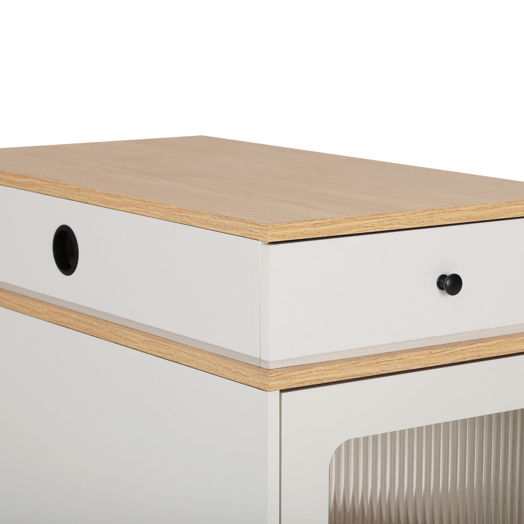 Enhance the utilization of limited kitchen space with the innovative double-sided storage design of this kitchen island.Each side features a drawer, with one side housing a cabinet with a glass door, while the other side offers open shelving.