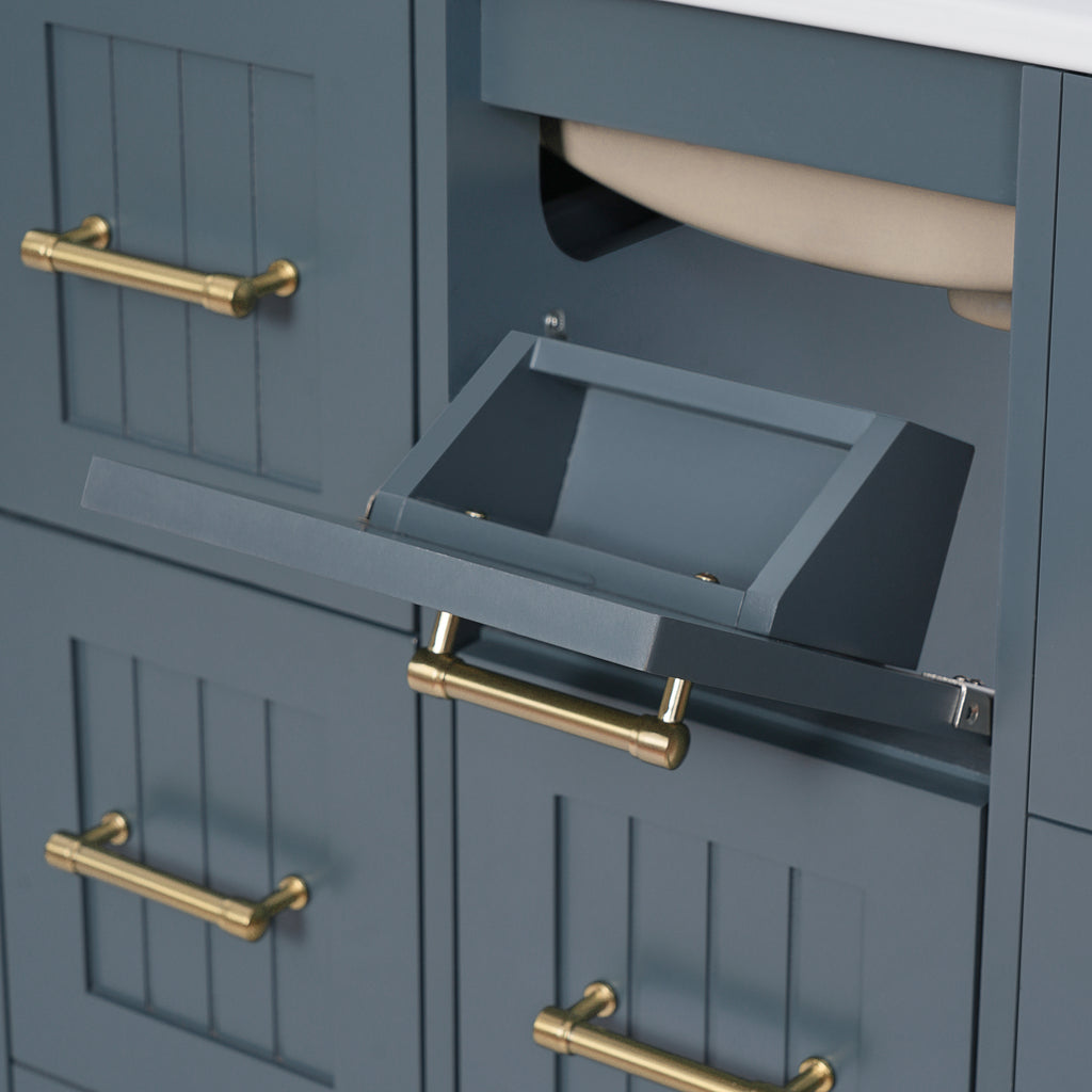 Crafted for both form and function, this bathroom cabinet offers a versatile storage solution to keep your space tidy and organized. It seamlessly combines a convenient tip-out drawer, two smooth-gliding drawers, and three enclosed compartments, providing a designated spot for all your bathroom essentials. The integration of quiet, soft-closing hinges and durable sliding rails ensures effortless and silent operation daily.