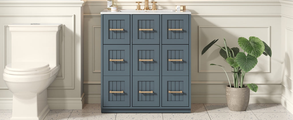• [Smart Storage Solutions] This bathroom cabinet is designed to meet all your storage needs. It features a versatile partition storage system that helps you organize your essentials with ease. The interior includes one convenient tip-out drawer, two smooth-gliding drawers, and three closed storage compartments. This combination provides flexible space for all your bathroom items, keeping them neatly arranged and within reach.