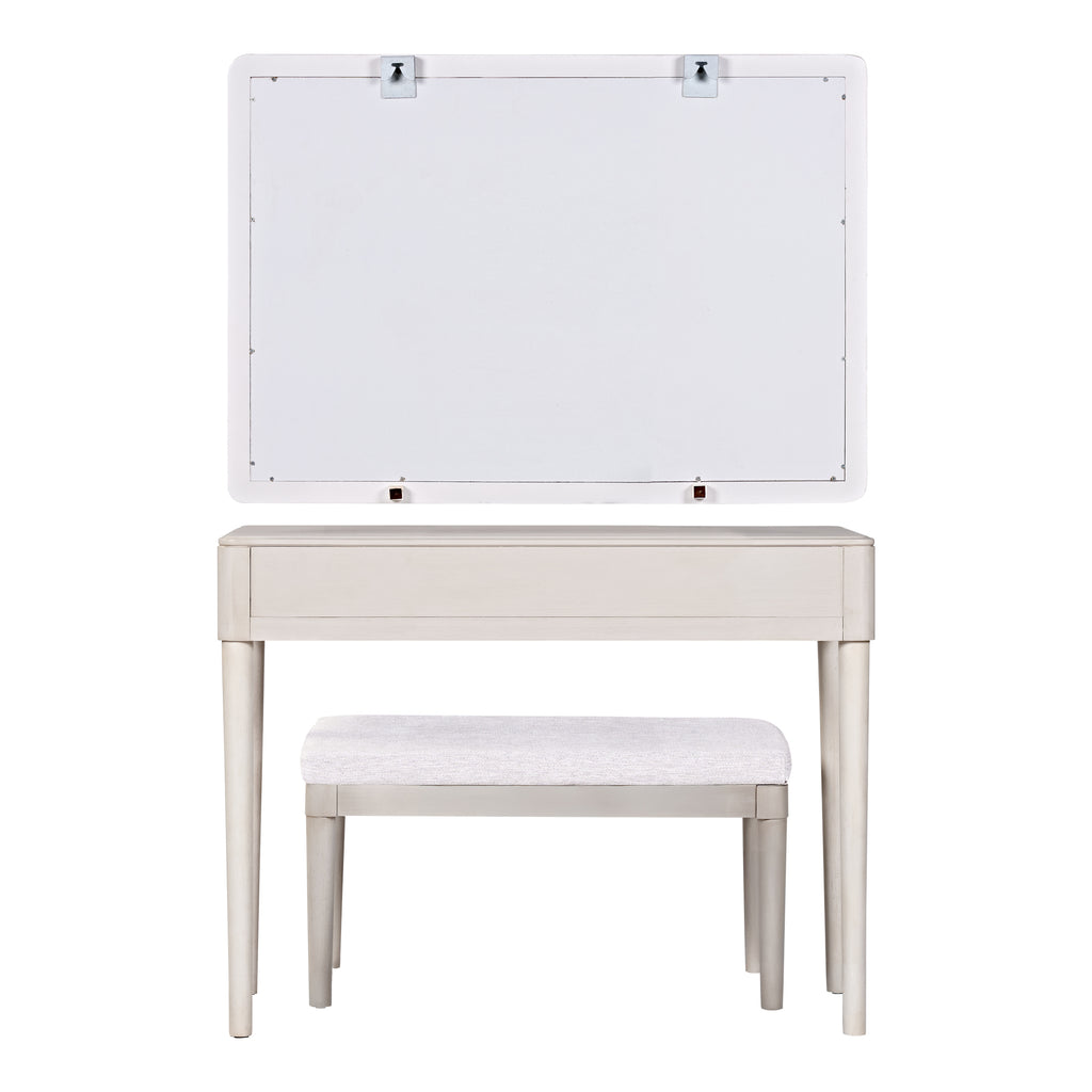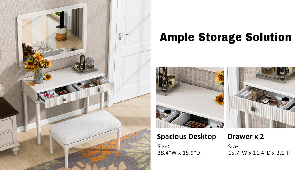 • Comfortable & Stylish Set with Mirror and Stool: The makeup vanity comes with a large square mirror (37.4' x 26.2') and a long bench (30.1' x 15.1' x 16.9') with a soft fabric cushion. The mirror offers a generous viewing area to enhance your grooming experience, while the bench provides comfortable seating. Both components can also be used separately, adding versatility and high-end comfort to your space.