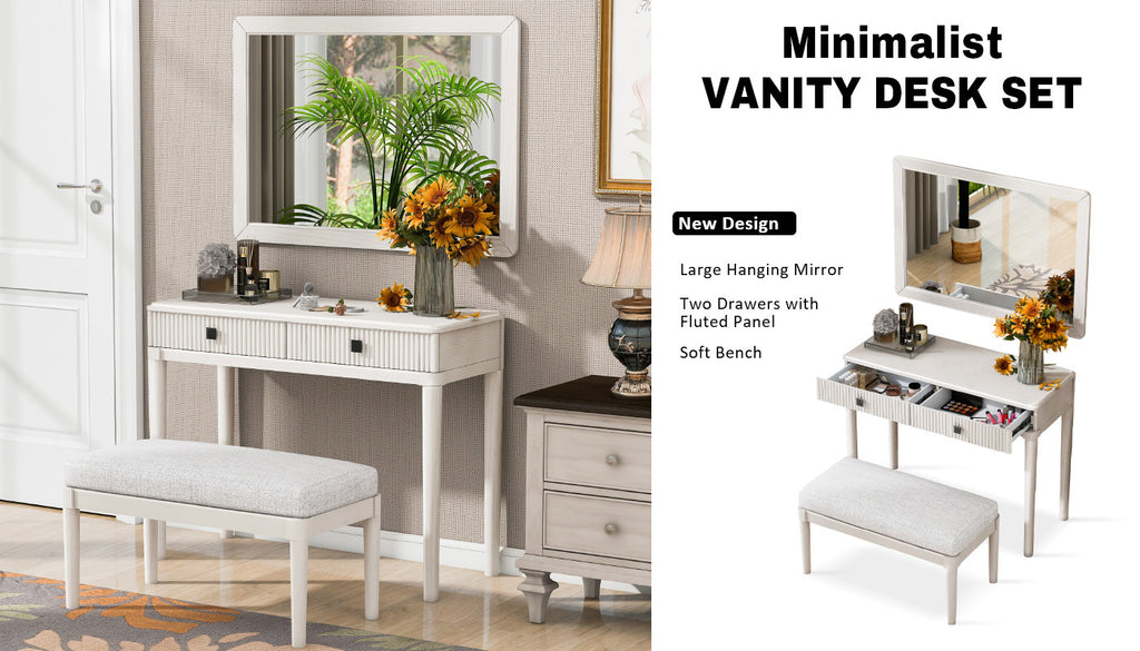 Modern Vanity Desk with Mirror, Adult Makeup Table Set with Stool, Home Office Desk, 2 Large Drawers, White
