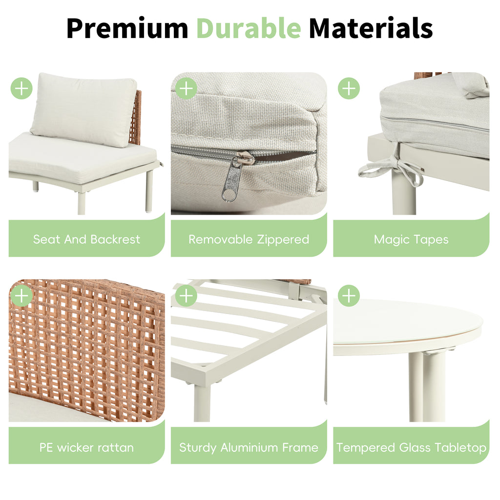 Crafted with a sturdy aluminium frame and high-quality PE wicker rattan(Each sofa supports up to 300 lbs, and each coffee table holds up to 110 lbs), this set is built to withstand outdoor elements. The tempered glass tabletops add a sleek, modern touch while ensuring durability and easy maintenance