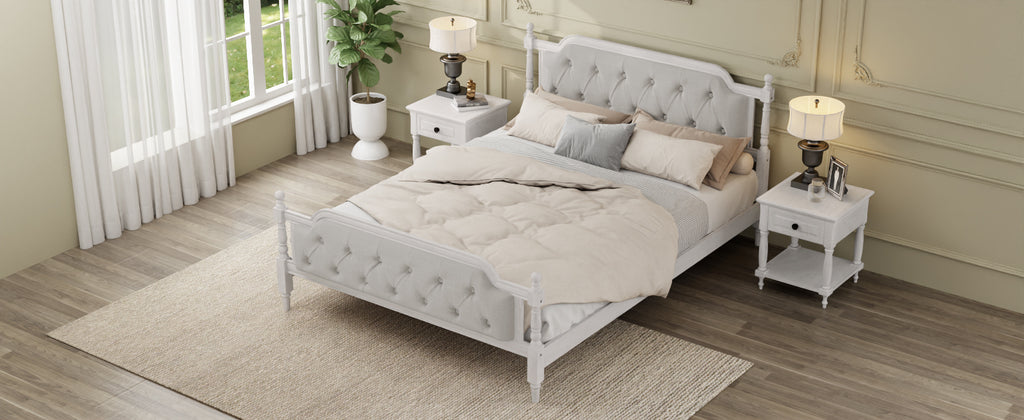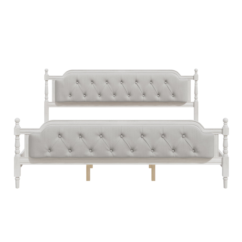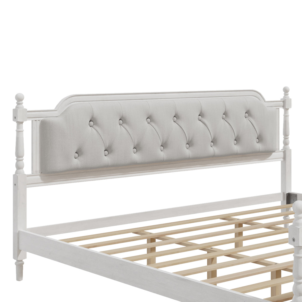 The wood bed's headboard is adorned with soft padded upholstery & tufted detailing, adding touch of luxury & sophistication to your sleeping space.