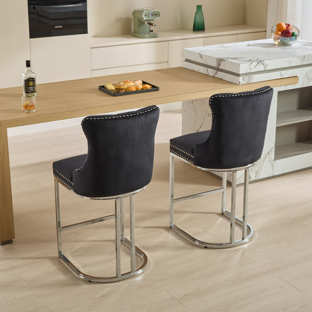 25' Counter Height Bar Stools Set of 2, Modern Velvet Barstools with Button Back&Rivet Trim Upholstered Kitchen Island Chairs with Sturdy Chromed Metal Base Legs Farmhouse Bar Stools, (Black,2 Pack)