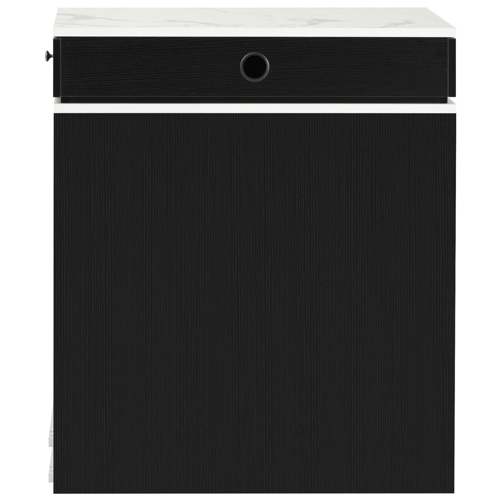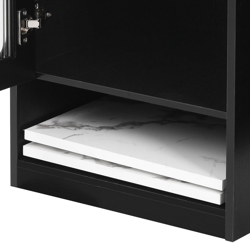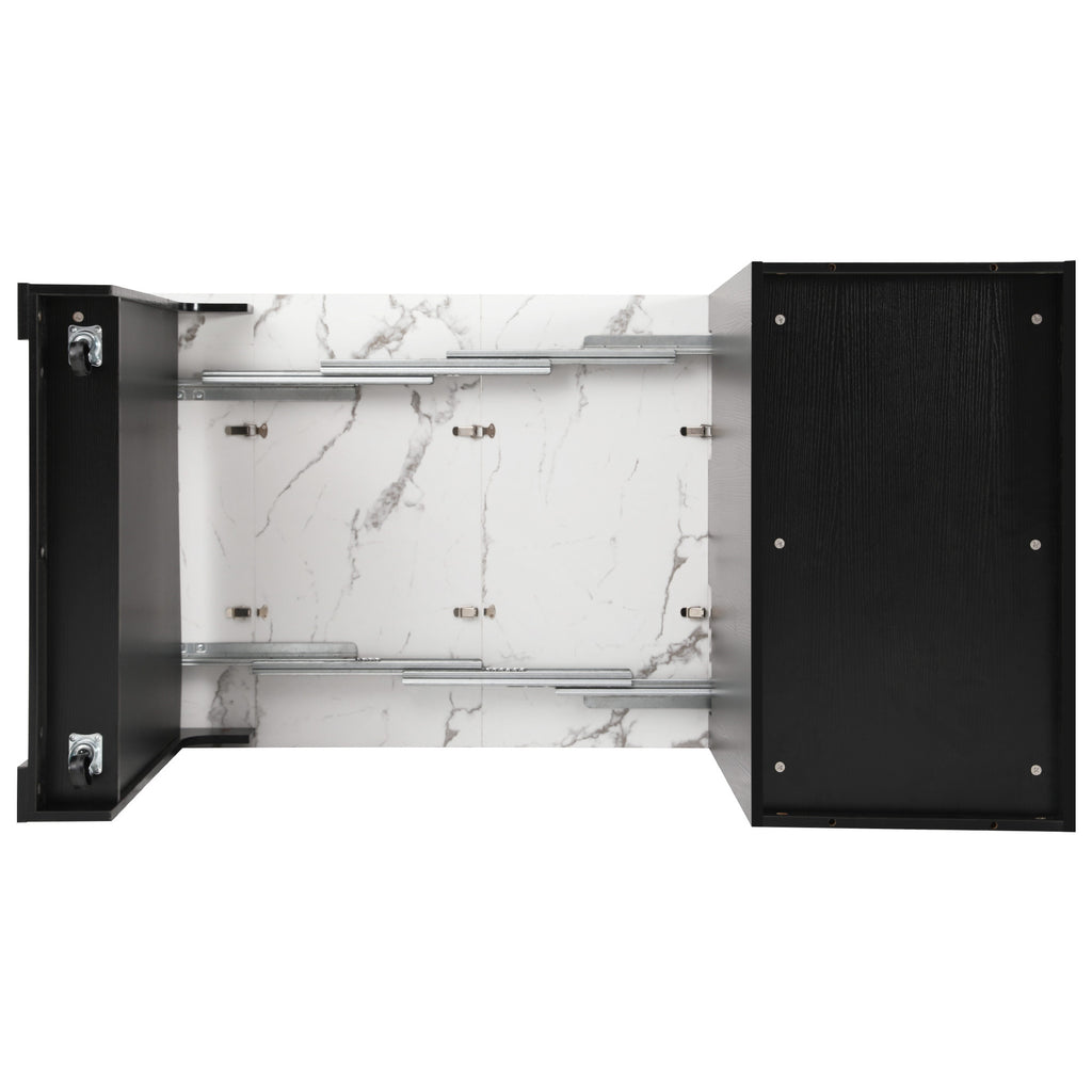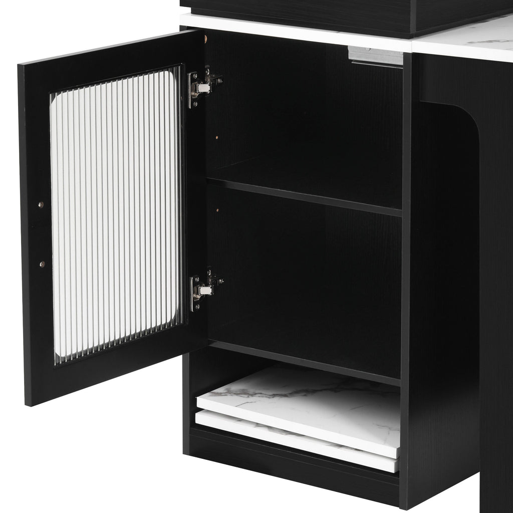 Black cabinetry paired with faux marble tabletops and a floating design create a minimalist yet sophisticated spatial ambiance.