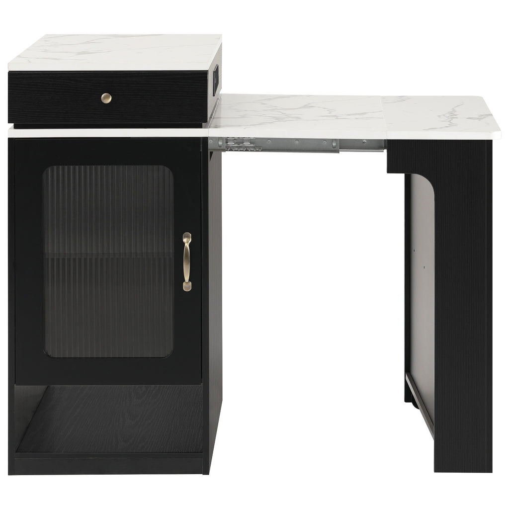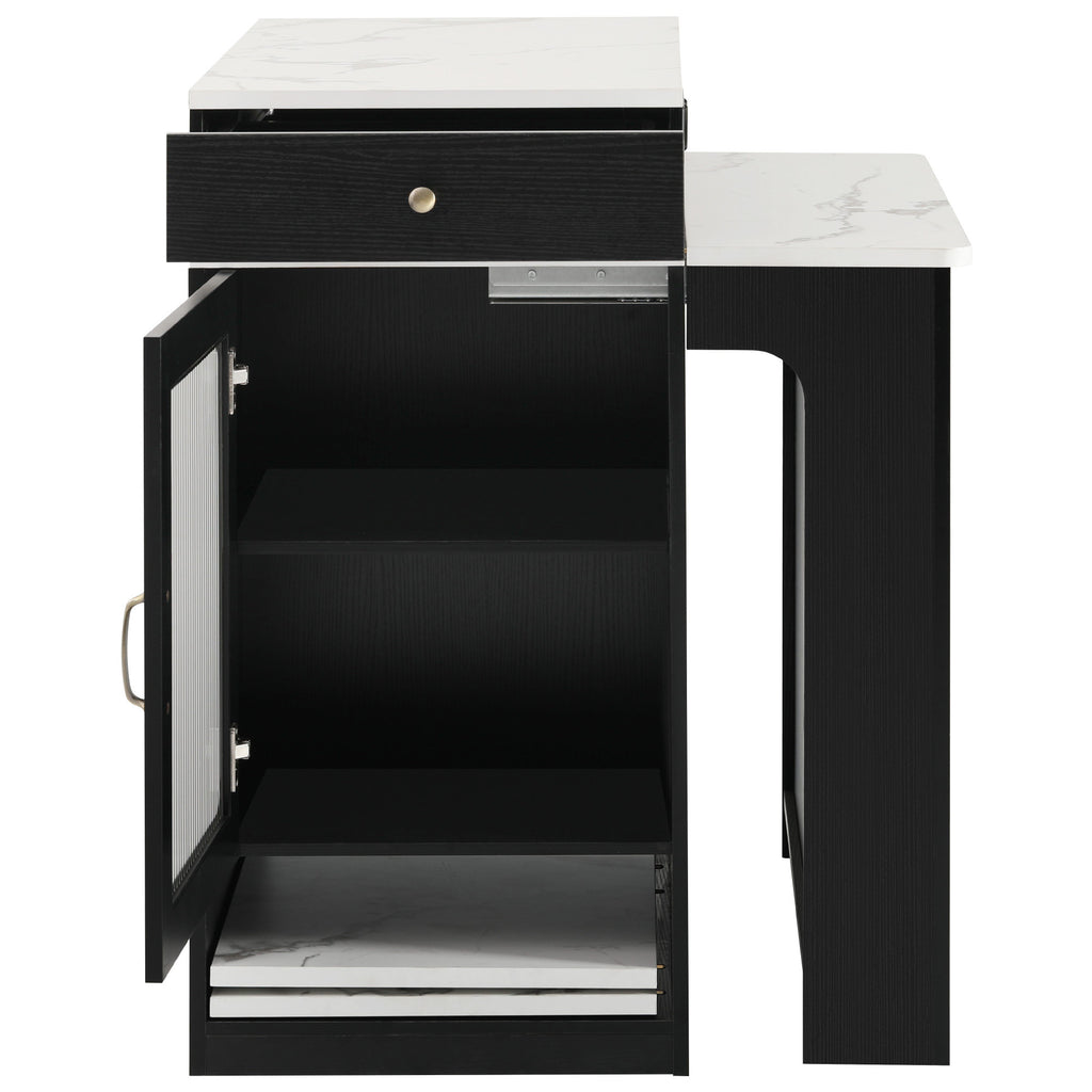 | Summary | This kitchen island is crafted from premium Particle Board and MDF, ensuring robust durability. Its surface is smooth and refined, complemented by a rich color palette and a glass cabinet door that elevates your kitchen space with unexpected sophistication. The extendable dining table design stands as its most distinctive feature. Its tabletop unfolds into three distinct lengths, allowing you to adapt it to varying needs and scenarios. The double-sized storage design features a cabinet on one side and an open storage compartment on the other side. Storage functionality is equally well-considered. Two drawers combined with open double-tier shelving on the sides accommodate all your kitchen storage needs. Balancing style and convenience, this extendable table features two casters for effortless movement during use. This kitchen island is sure to satisfy you in every way. |