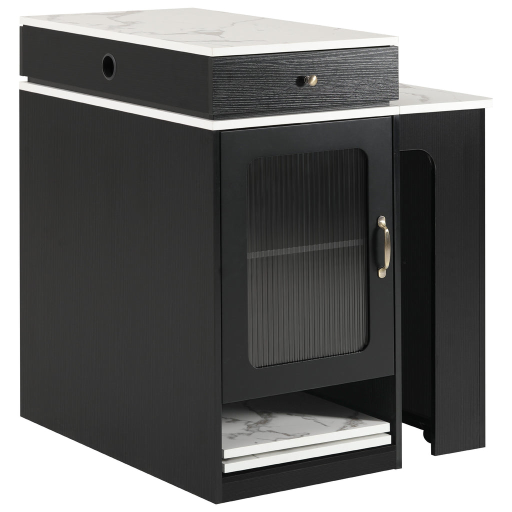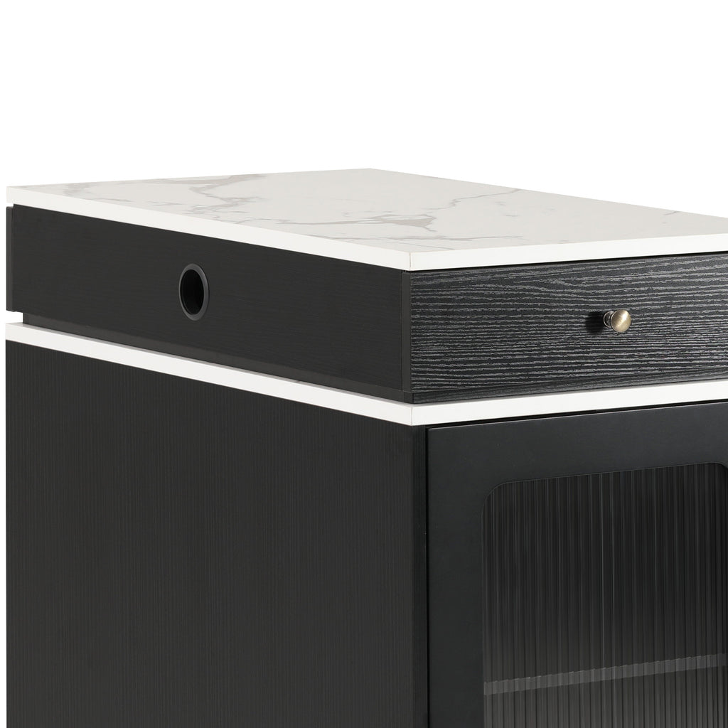 Enhance the utilization of limited kitchen space with the innovative double-sided storage design of this kitchen island.Each side features a drawer, with one side housing a cabinet with a glass door, while the other side offers open shelving.