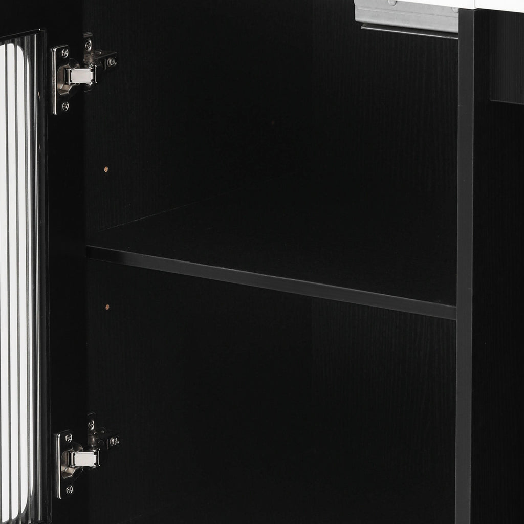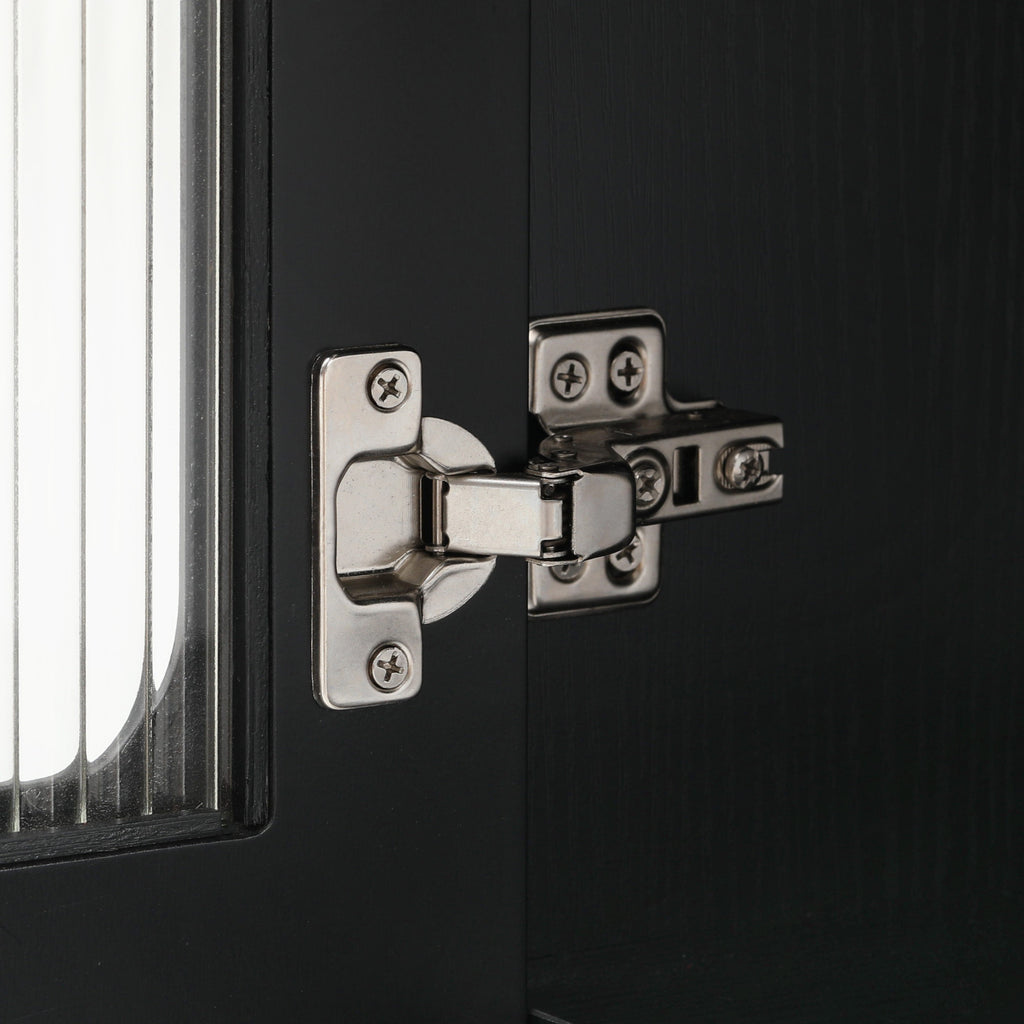 Each side features an adjustable shelf. Height-adjustable shelves inside the cabinet doors provide flexibility in accommodating various kitchen items of different sizes.