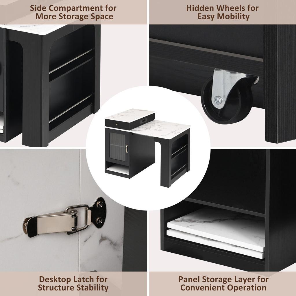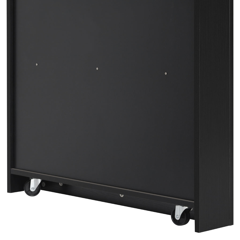 The bottom of the extendable tabletop and storage rack features two movable casters. This allows you to effortlessly pull out the tabletop and storage rack when in use. It enhances the product's mobility, making it adaptable to various spaces in your home.