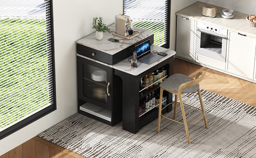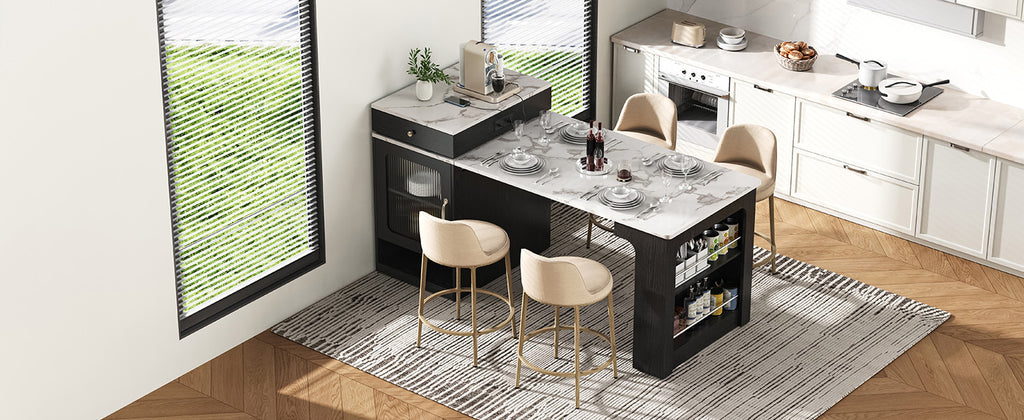 - [Double-sided Storage Design] This kitchen island features an innovative double-sided storage design that maximizes limited kitchen space. Each side features a drawer, with one side housing a cabinet with an adjustable shelf and a glass door, while the other side offers open shelving. Whether faces left or right, the island provides ample usable space from every angle. It also includes a convenient two-tiered side storage area on the extended dining table, making it easy to access condiments and