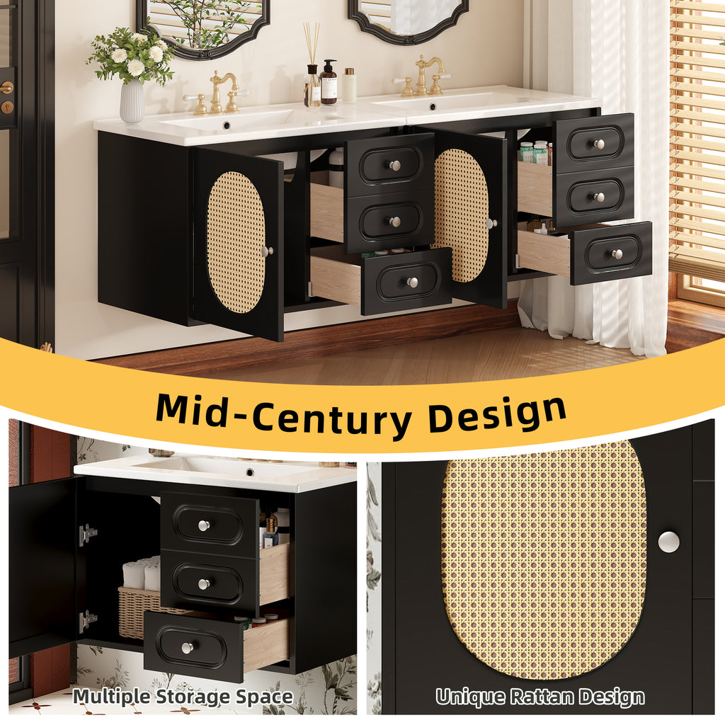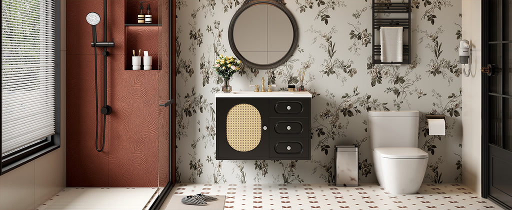 This stylish bathroom cabinet blends mid-century modern design with practical functionality for today's homes. The elegant piece features unique rattan detailing that adds natural texture, while its spacious interior includes two full-extension drawers and multiple storage compartments to keep your essentials organized. Crafted from premium moisture-resistant MDF, the cabinet boasts a sturdy base for stability and comes with quiet soft-closing hinges for peaceful operation. The glossy ceramic basin sink resists stains and scratches, complemented by durable metal handles for a refined finish. Practical touches like 4-inch faucet compatibility (faucet not included), anti-overflow drainage, and accessible plumbing holes make installation and daily use effortless. Perfect for creating a clutter-free, designer-inspired bathroom space.
