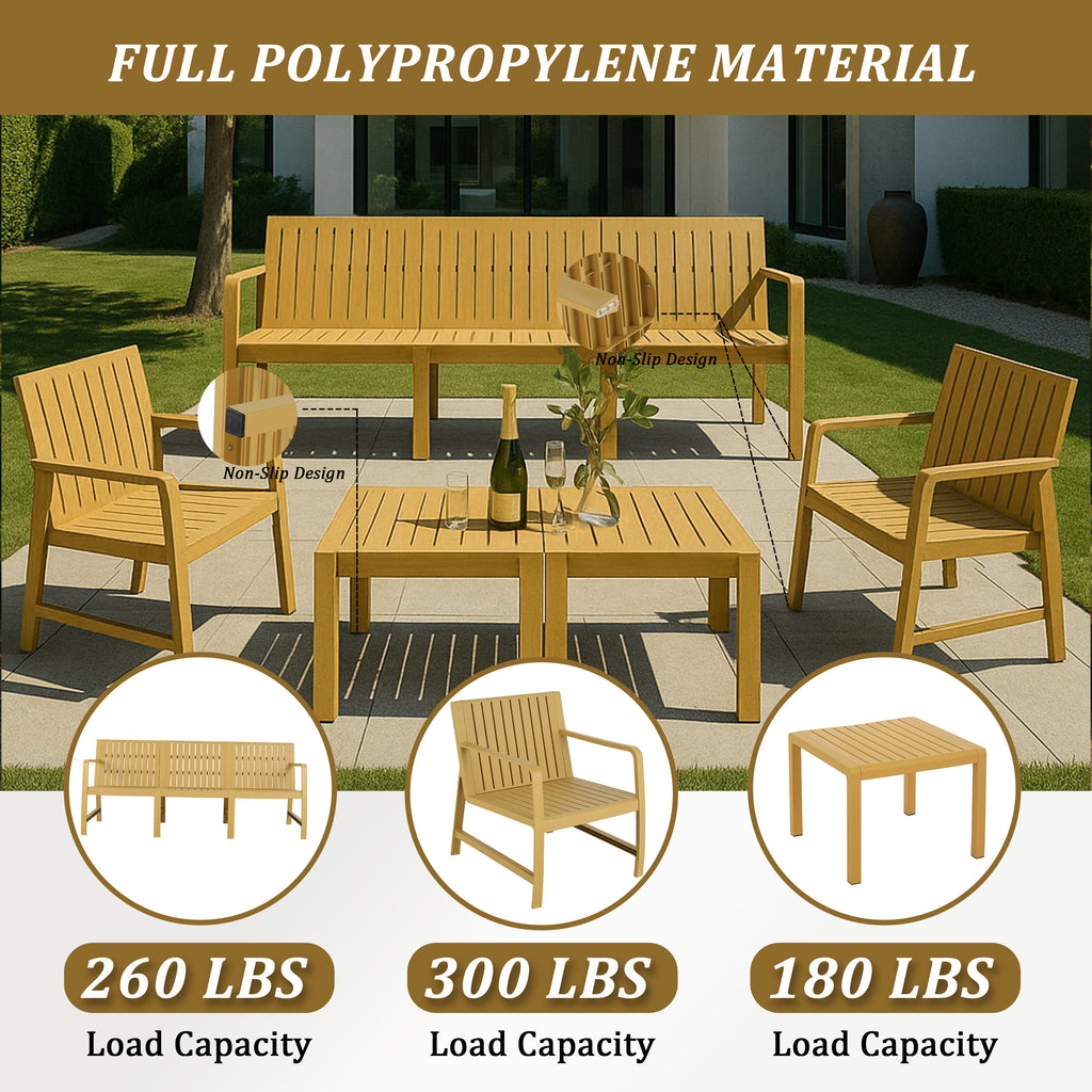 • Premium All-Weather Durability·High-Grade PP Material: Weatherproof construction resists water, UV rays (17,520+ outdoor hours), and wear while preventing mold/mildew;Lightweight yet ultra-durable (supports 300+ lbs per seat) – perfect for daily indoor/outdoor use;Zero-Maintenance Cleanup: Spills wipe away instantly – no stains or special cleaners needed.