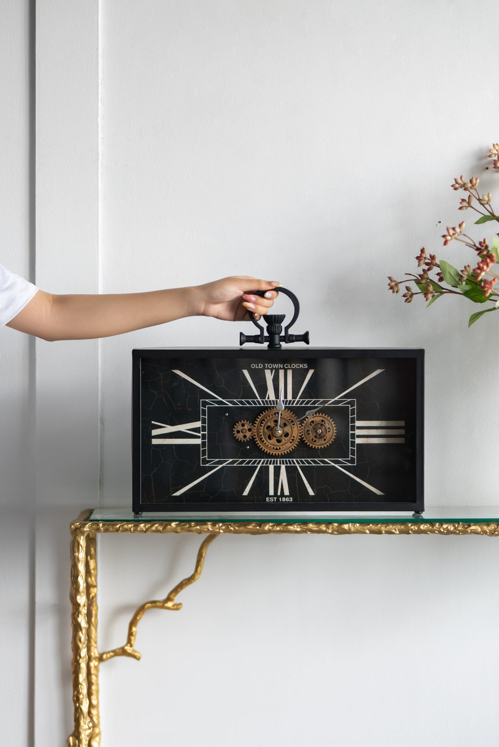 • This table clock draws inspiration from old-town London decor, boasting a black rectangular silhouette, white Roman numerals, and a cluster of golden gears that operate silently within a glass casing.