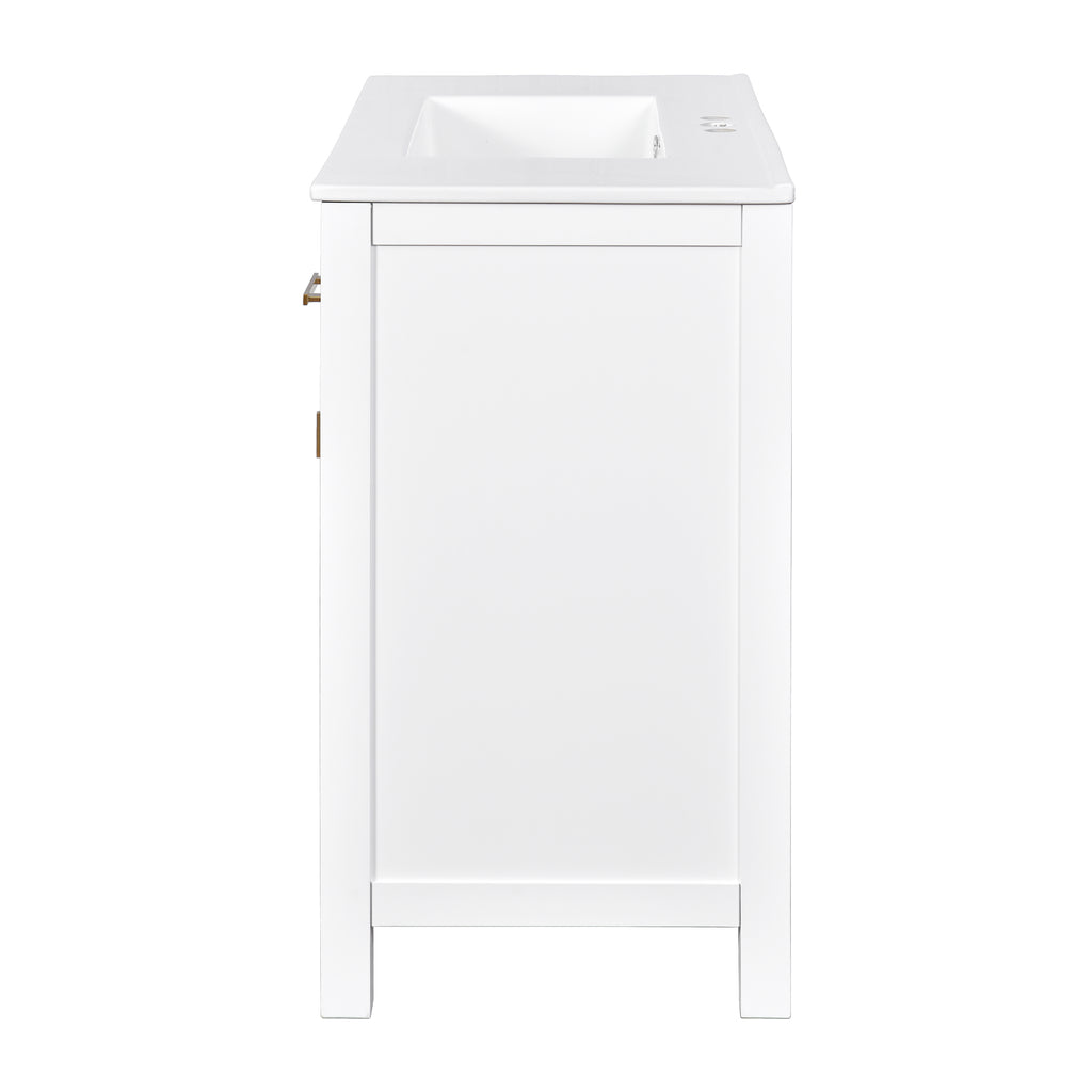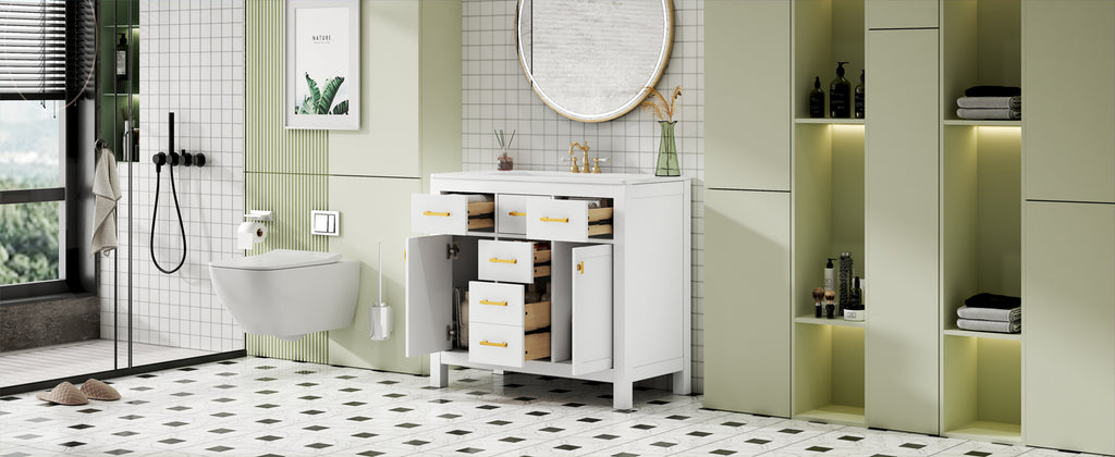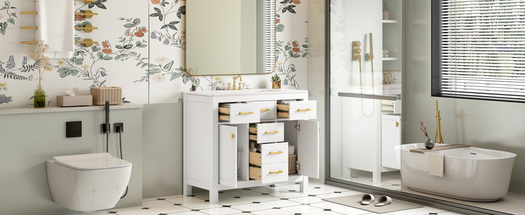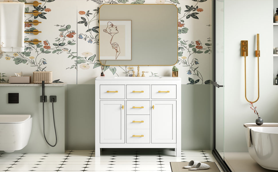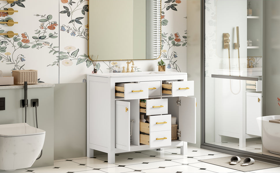36'' Bathroom Vanity with Ceramic Sink Combo Set,Modern Freestanding Single Bathroom Cabinet with 4 Drawers & 2 Cabinets,Storage Cabinet for Bathroom, Solid Wood Frame Vanity Set, White