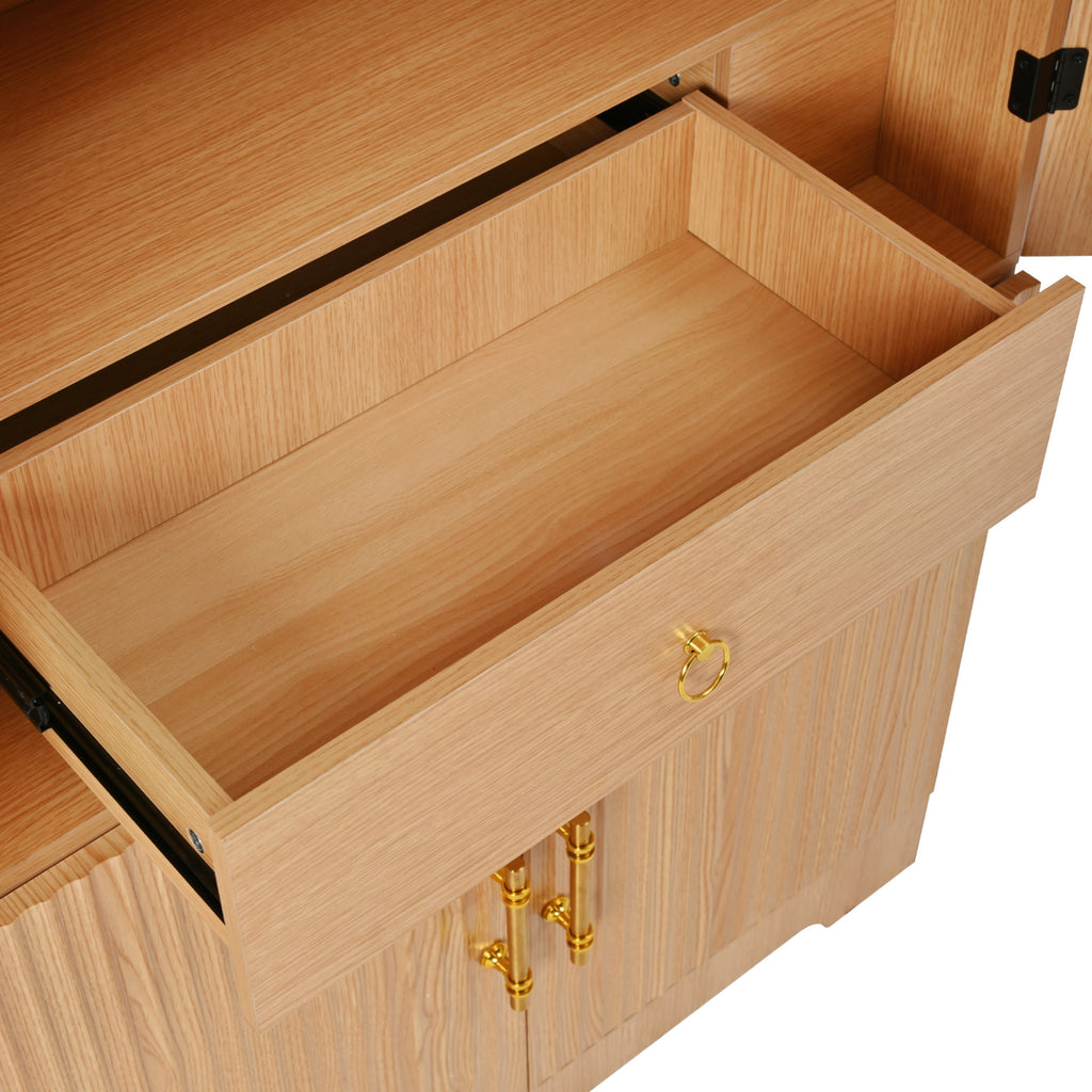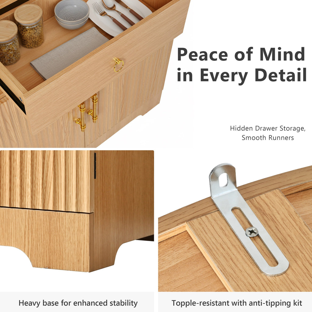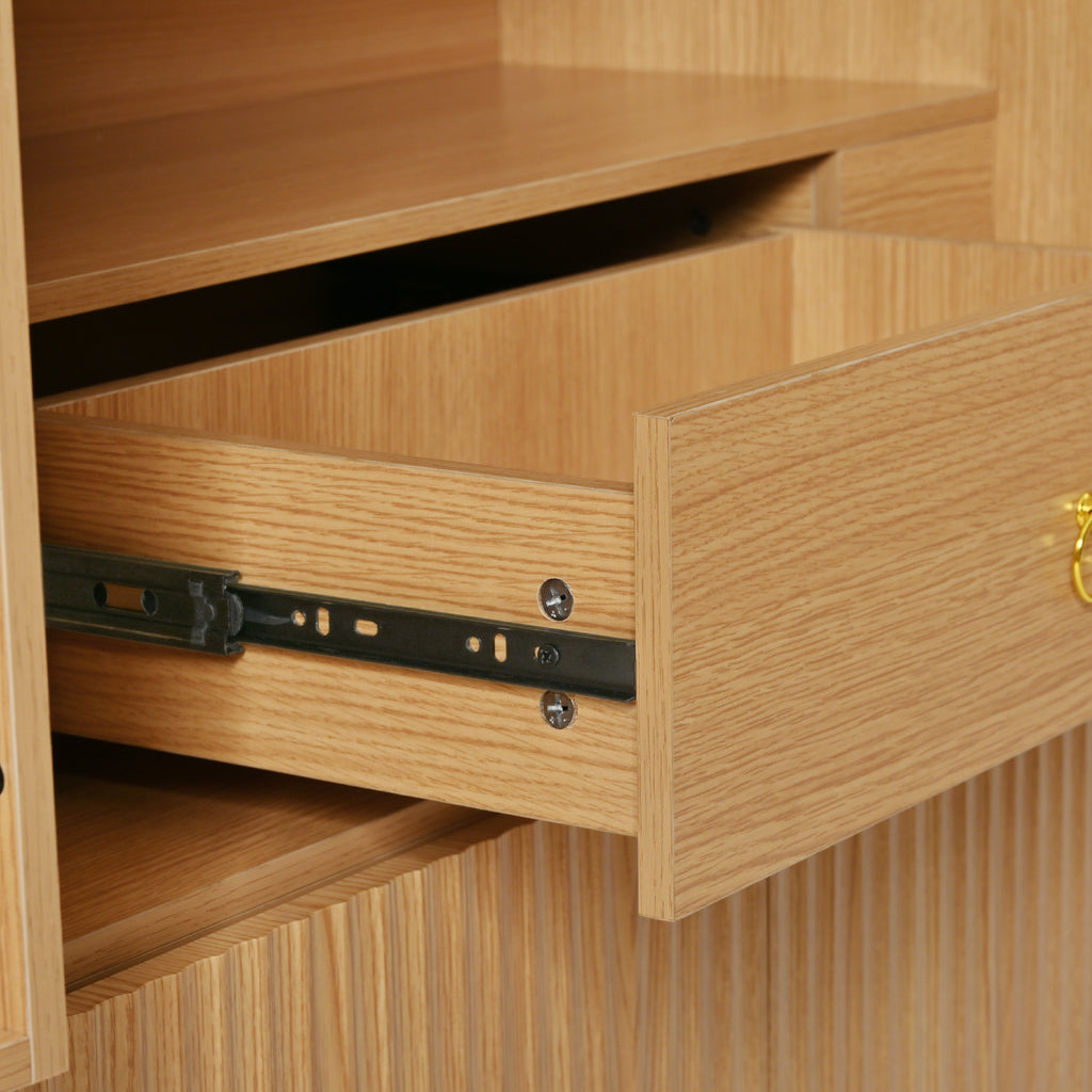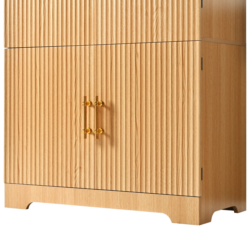 Highlights [Unique Arched Design][72”H Large Kitchen Pantry Cabinet] [Natural Wood Grain][Fluted Wave Panel][Accent Gold Handles] [4 Doors + 1 Hidden Drawer][8 Door Internal Storage Rack with Sticks] [3 Adjustable Shelves][Manufactured P2 MDF Board] [Smooth Drawer Sliding Rail][Anti-tip Kit]