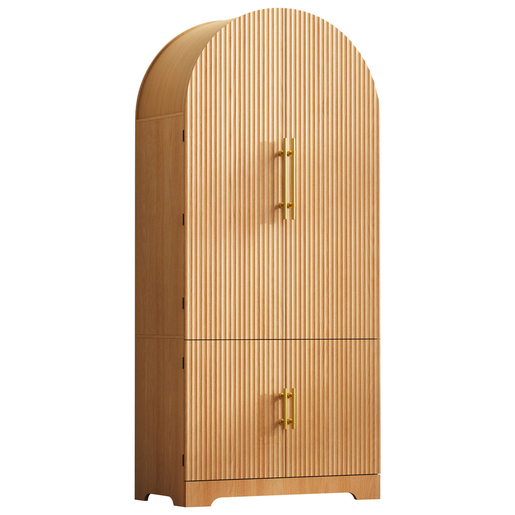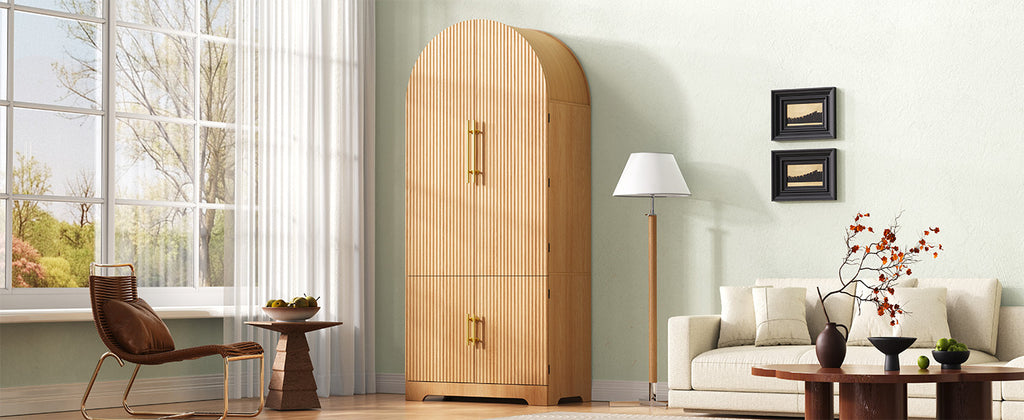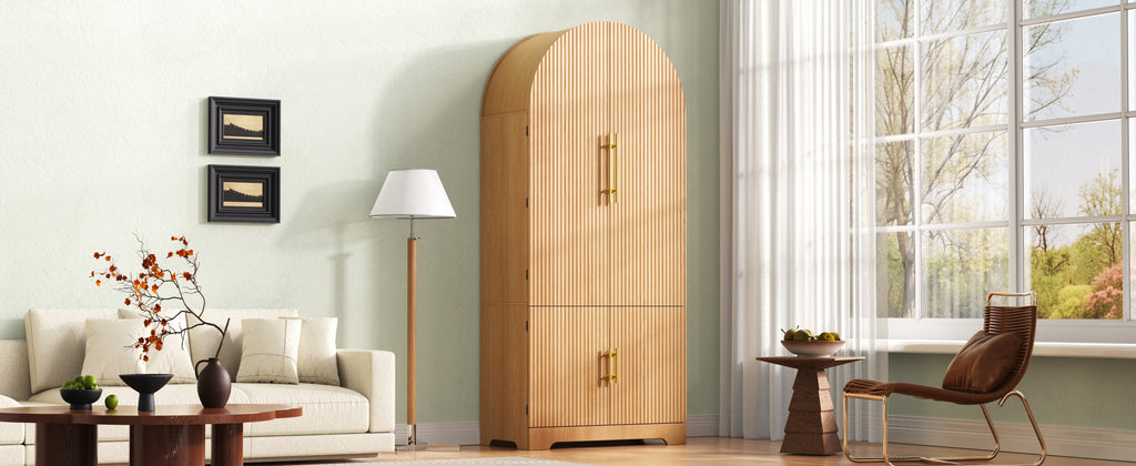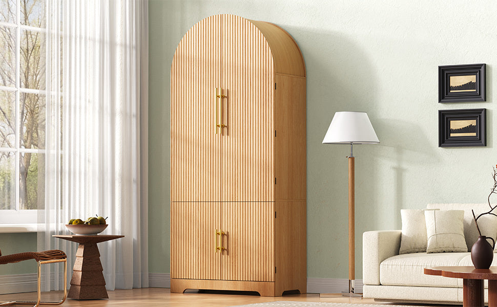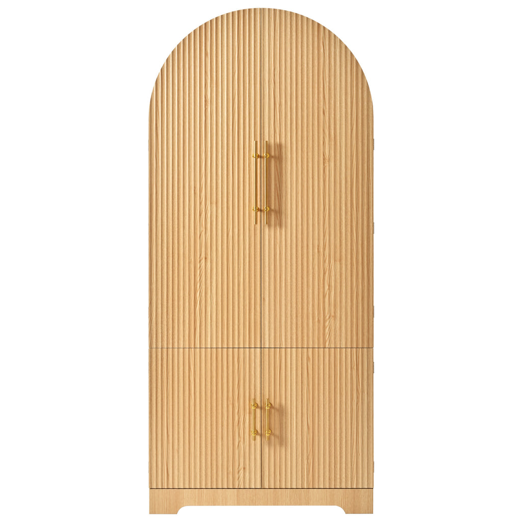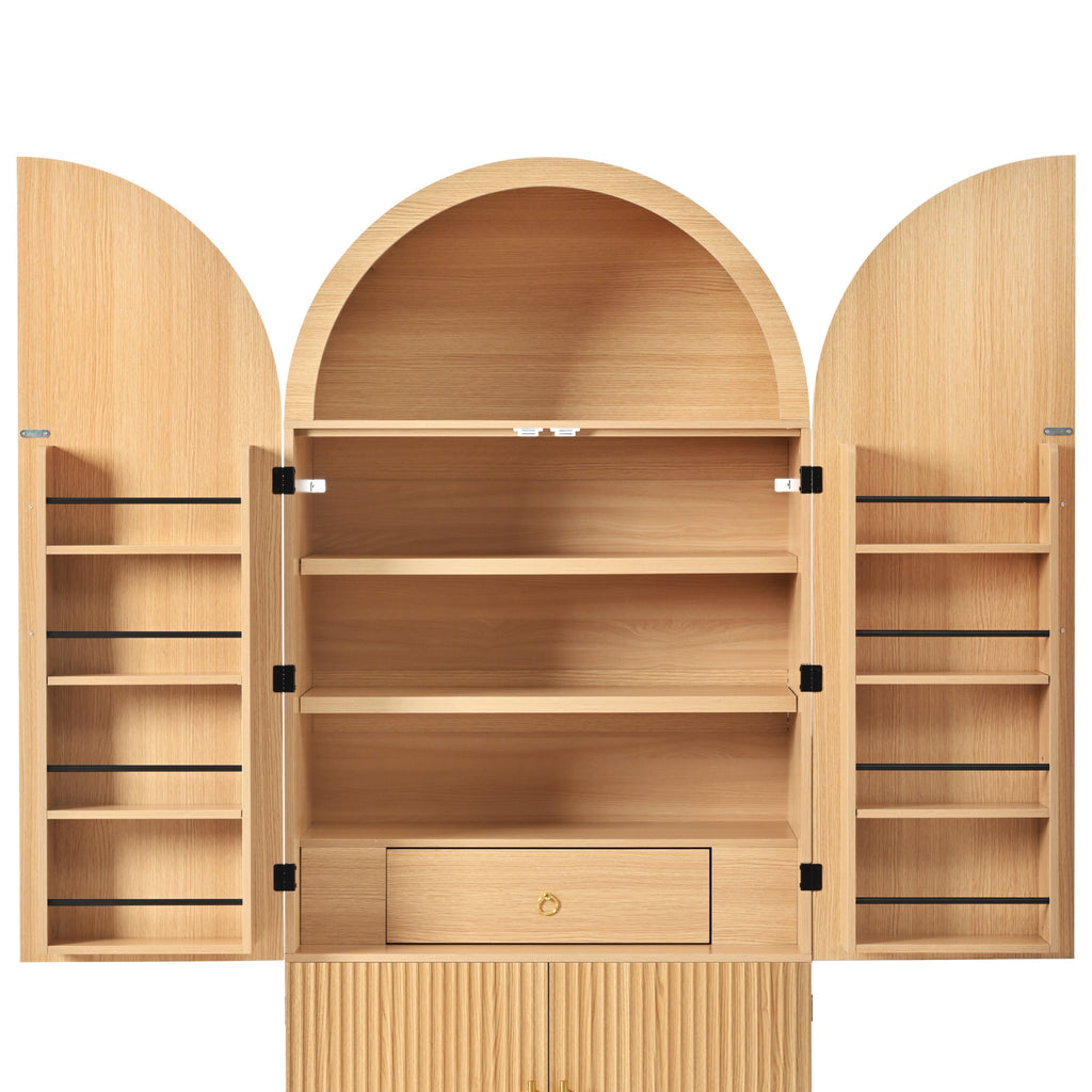 Summary Introducing the Arched Storage Cabinet with fluted panel, which enhances your space with enchanting wood grain design. This cabinet combines elegance and practicality, measuring 72 inches in height, 31.5 inches in length, and 15.75 inches in width. It offers generous storage with three adjustable shelves and a eight-door design to customize your needs. The distinctive arched silhouette features sophisticated brass handles, adding timeless charm to any room. Versatile and adaptable, this cabinet is perfect for the kitchen, living room, bedroom, home office, or bathroom room—an ideal choice for those seeking both functionality and style.