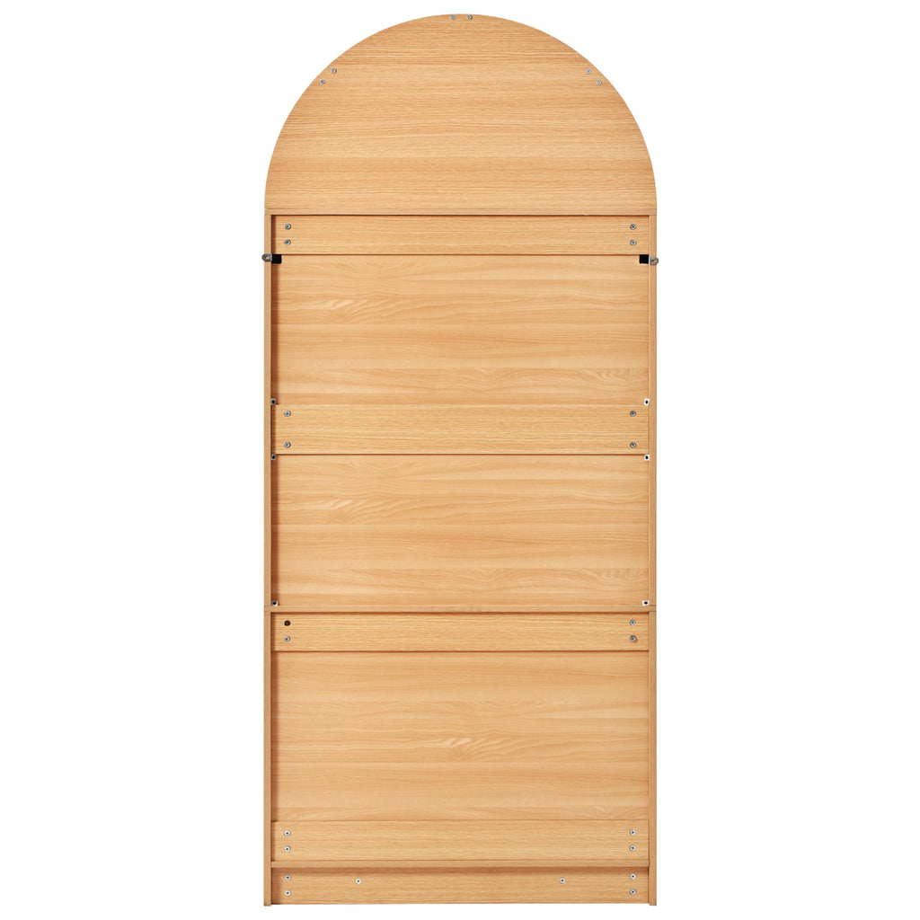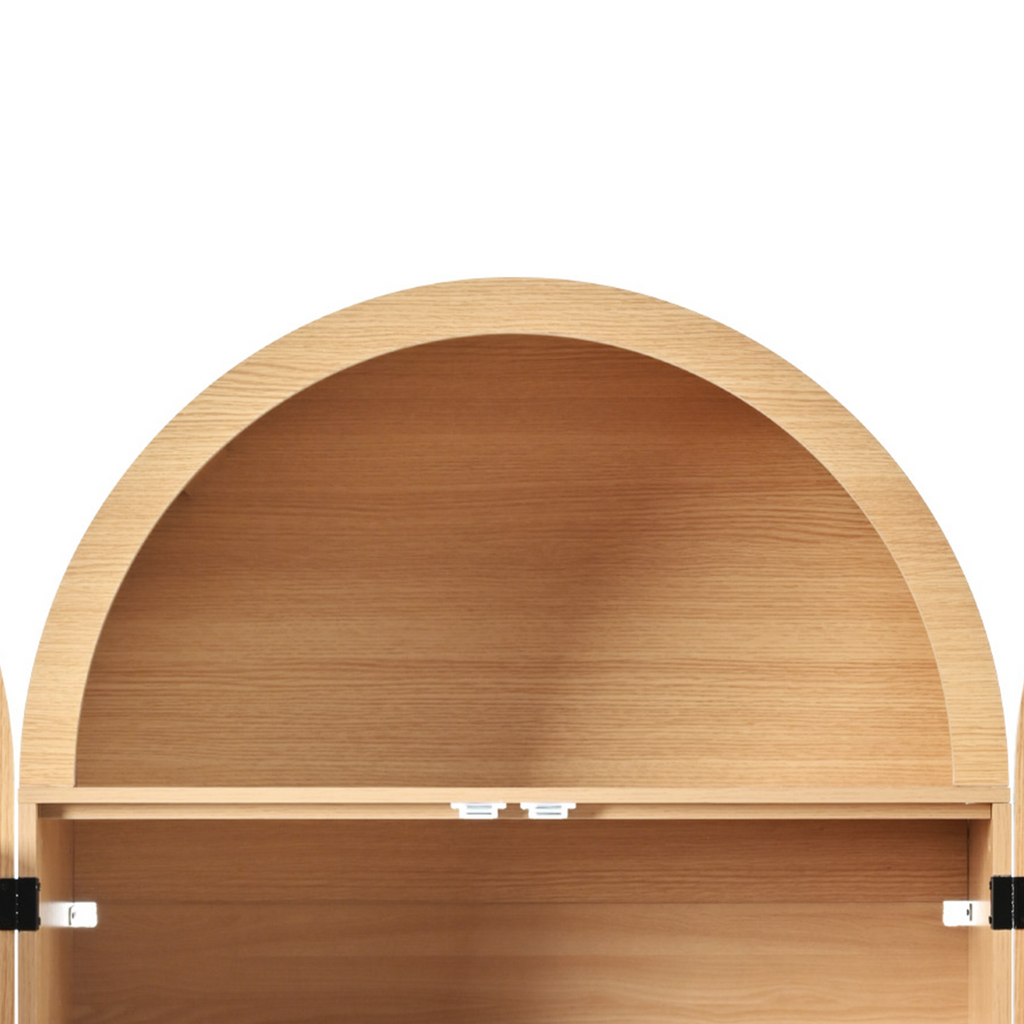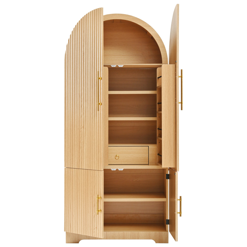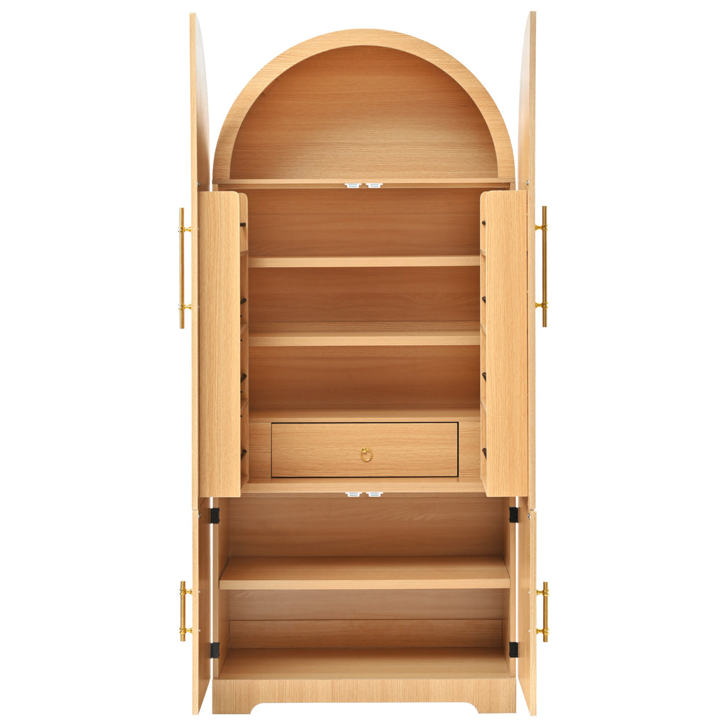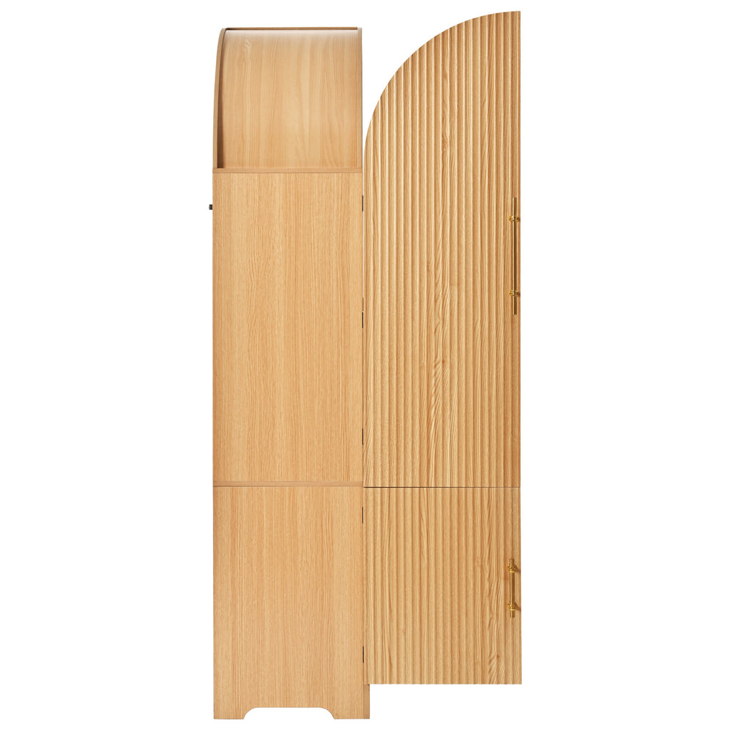 Summary Introducing the Arched Storage Cabinet with fluted panel, which enhances your space with enchanting wood grain design. This cabinet combines elegance and practicality, measuring 72 inches in height, 31.5 inches in length, and 15.75 inches in width. It offers generous storage with three adjustable shelves and a eight-door design to customize your needs. The distinctive arched silhouette features sophisticated brass handles, adding timeless charm to any room. Versatile and adaptable, this cabinet is perfect for the kitchen, living room, bedroom, home office, or bathroom room—an ideal choice for those seeking both functionality and style.