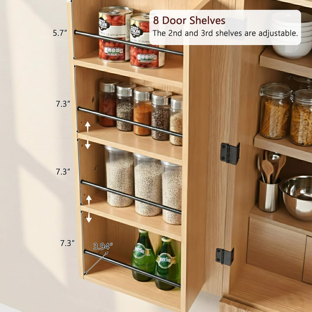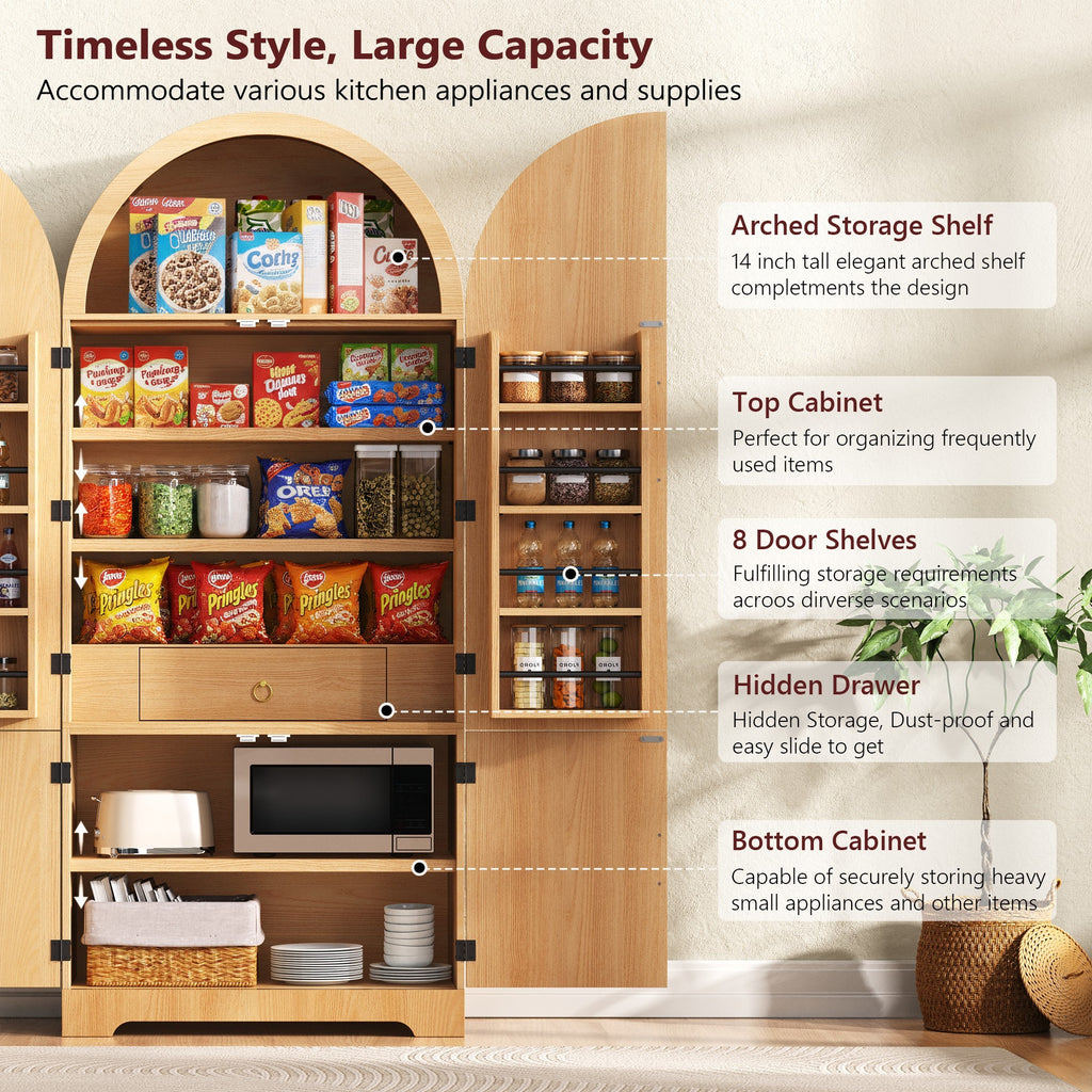 K&K 72' Tall Arched Kitchen Pantry Cabinet with 8 Door Shelves, Fluted Storage Cabinets with 3 Adjustable Shelves, Hidden Drawer, Versatile Cupboard for Kitchen, Dining & Bath Room, Natural