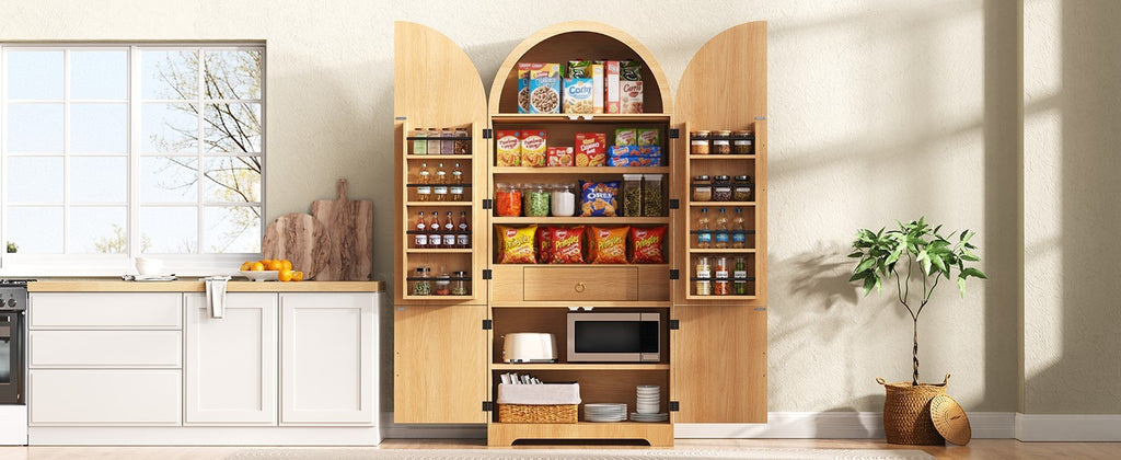 The arched cabinet featuring a charming arched top, stylish fluted doors, and a spacious drawer, the kitchen pantry cabinet is as much about style as it is about functionality, making it a perfect addition to the kitchen.