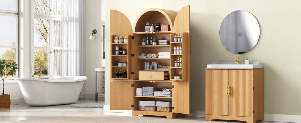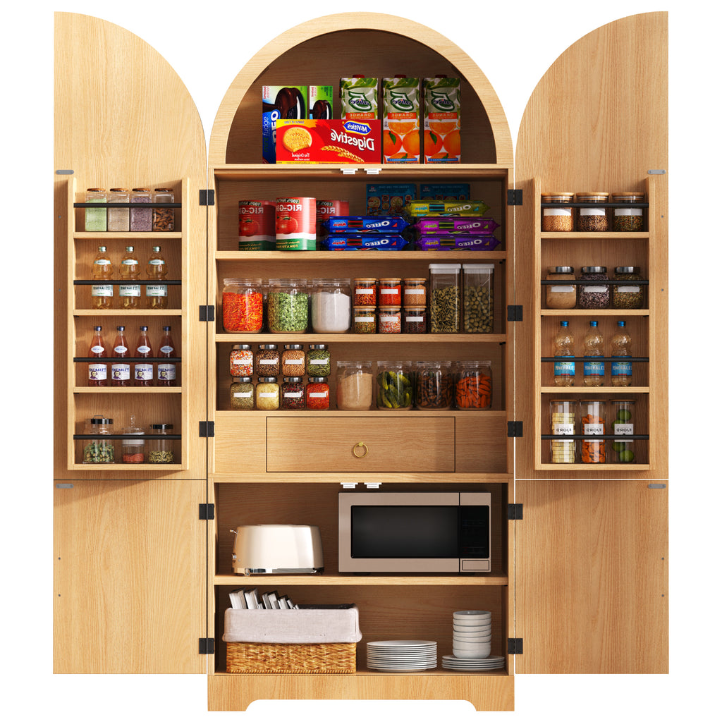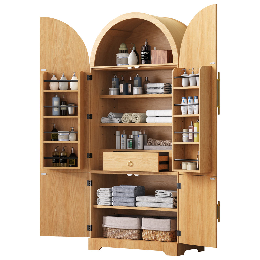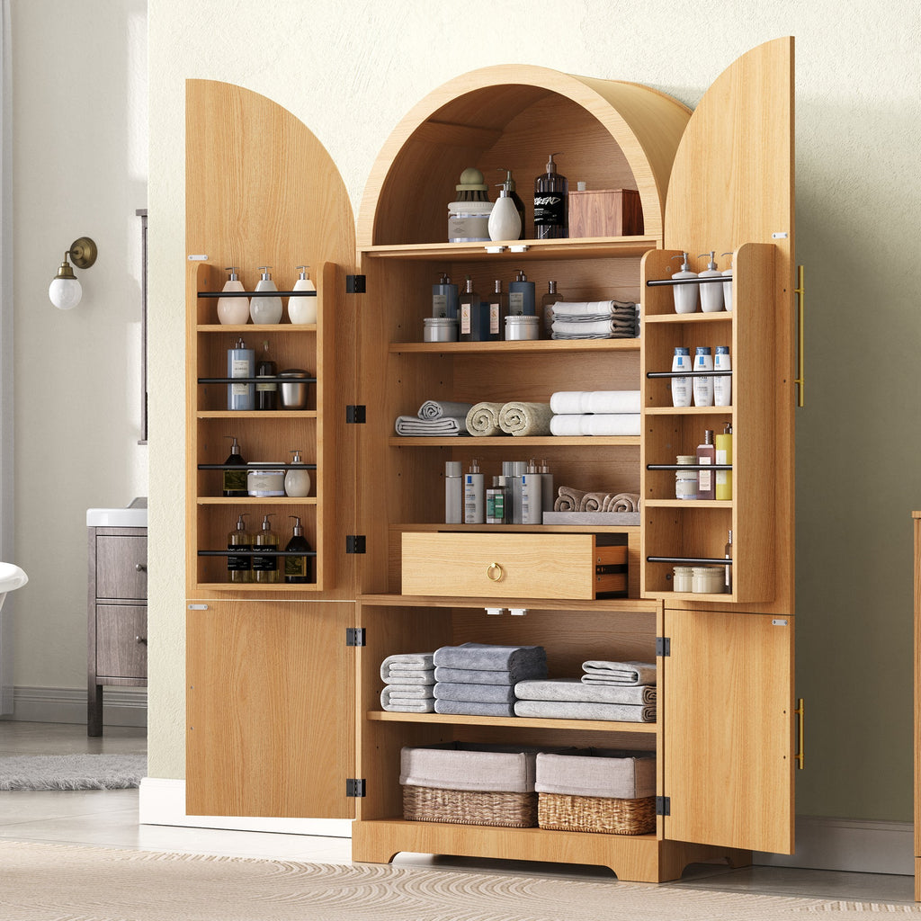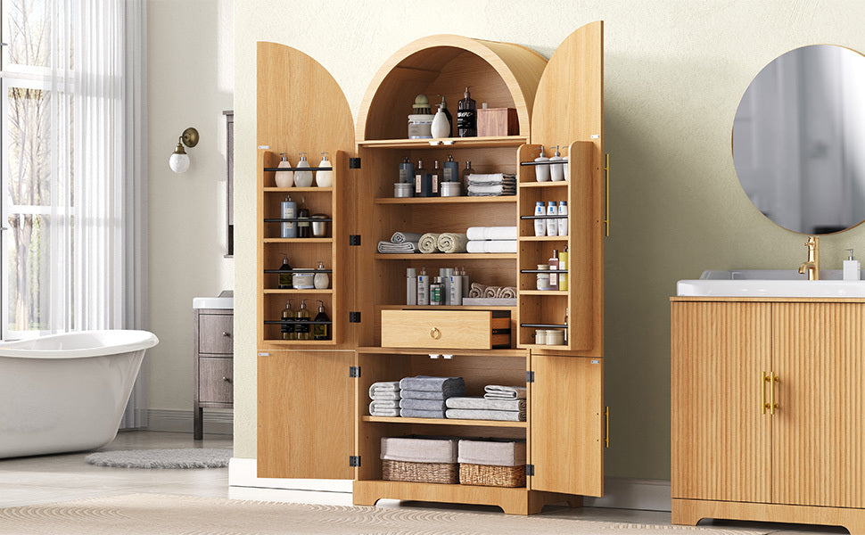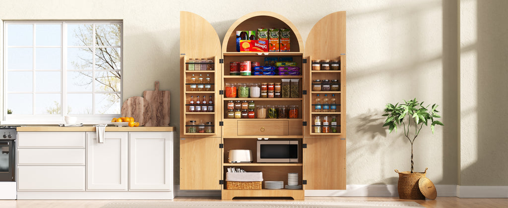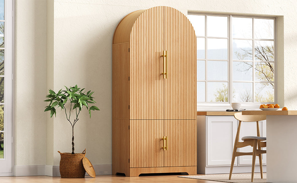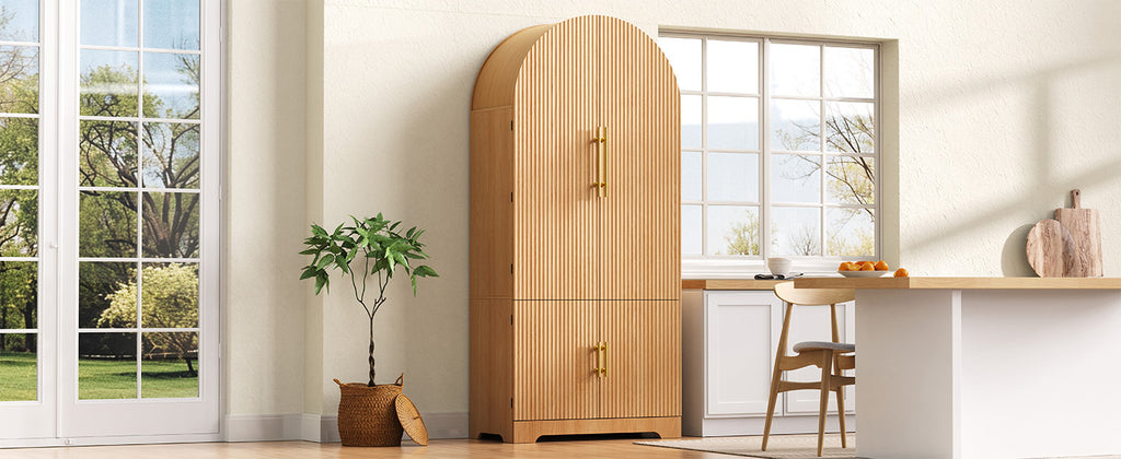 • [Elegant Arch & Fluted Design] Elevate your space with this modern pantry, featuring a chic arched top and handcrafted fluted doors. The gently curved, wave-inspired fluted panels add depth and texture, while the smooth wood finish blends clean lines with organic warmth. Designed to transcend trends, the accent gold handles allow this cabinet to complement mid-century and farmhouse decor easily. Perfect as a kitchen pantry, dining room storage, living room accent, or even a bathroom organizer.