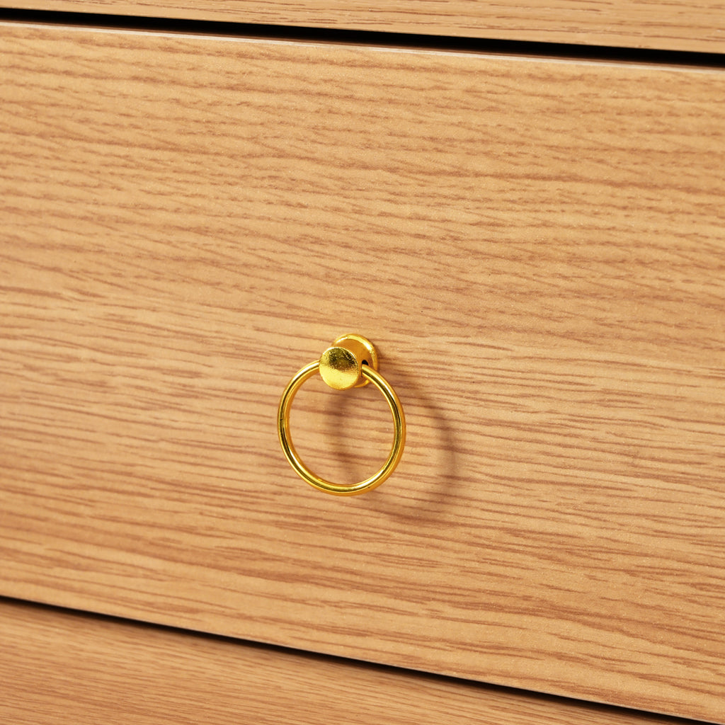 Elevated details like accent gold handles and trendy arched details, paired with natural wood grains, create a timeless and inviting space with a touch of sophistication