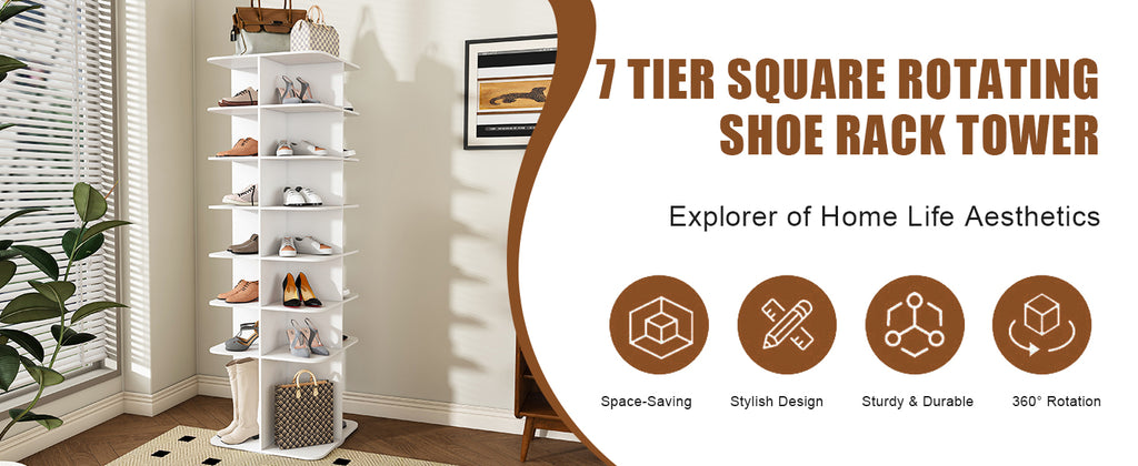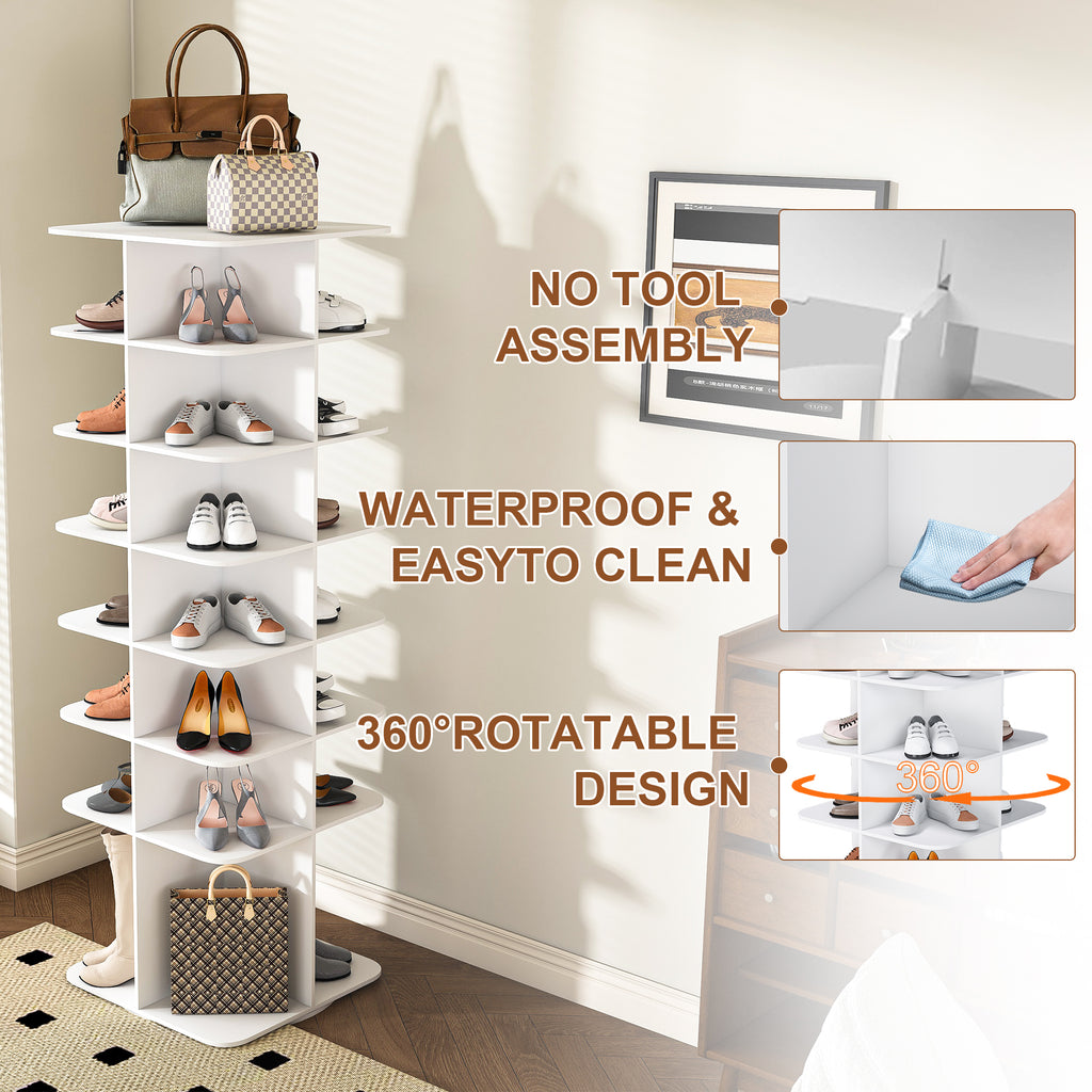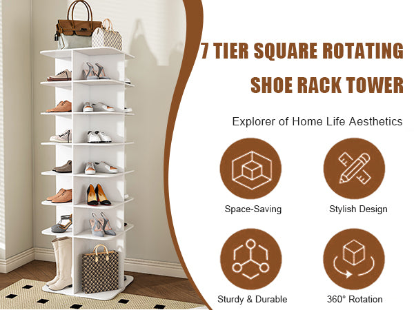 7-Tier Square Rotating Shoe Rack Tower with 360° Spinning Organizer, White