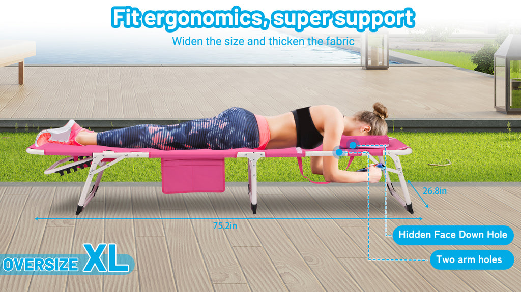 • 【ADJUSTABLE 5 POSITION LOUNGE CHAIR】 : Designed with 5 positions adjustable locking system, this sturdy folding cot allows you to adjust it to a comfortable position as your needs.You can recline or lay flat.This ergonomic design is good for your back, can also help reducing muscle tension and stress.Updated locker system can make sure the sturdy of the chair when you lay on it.