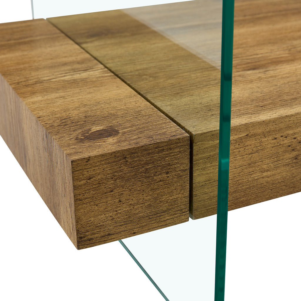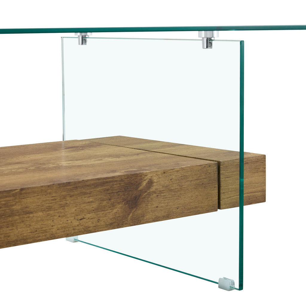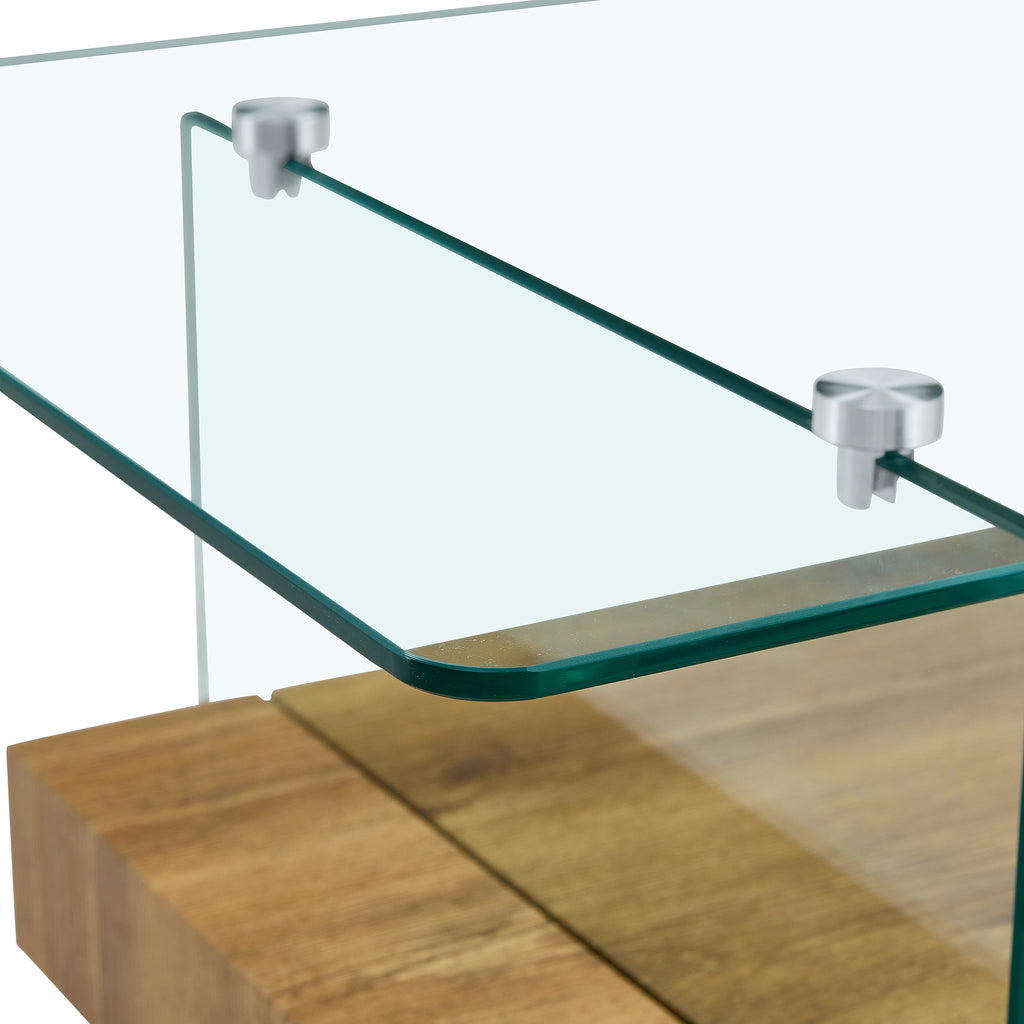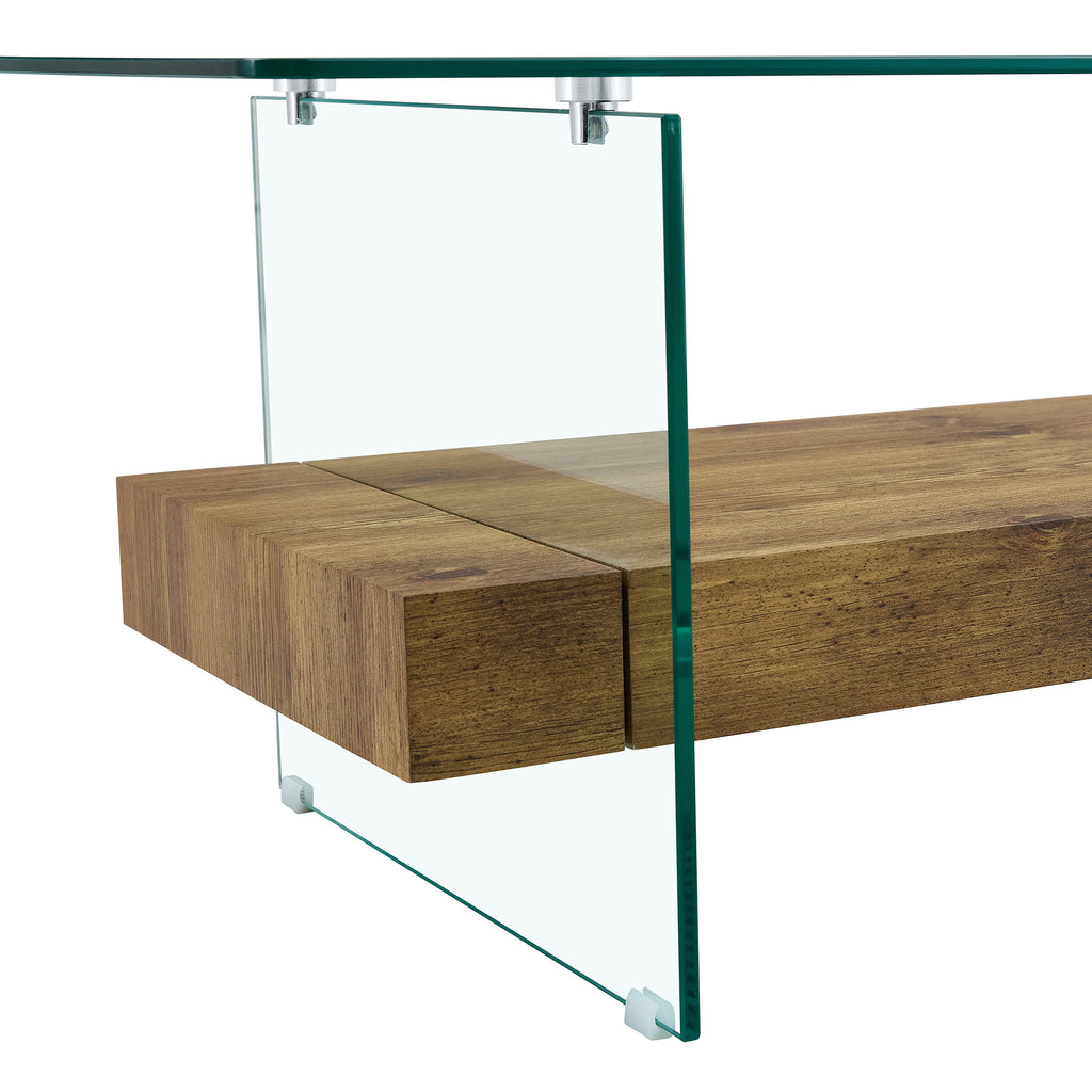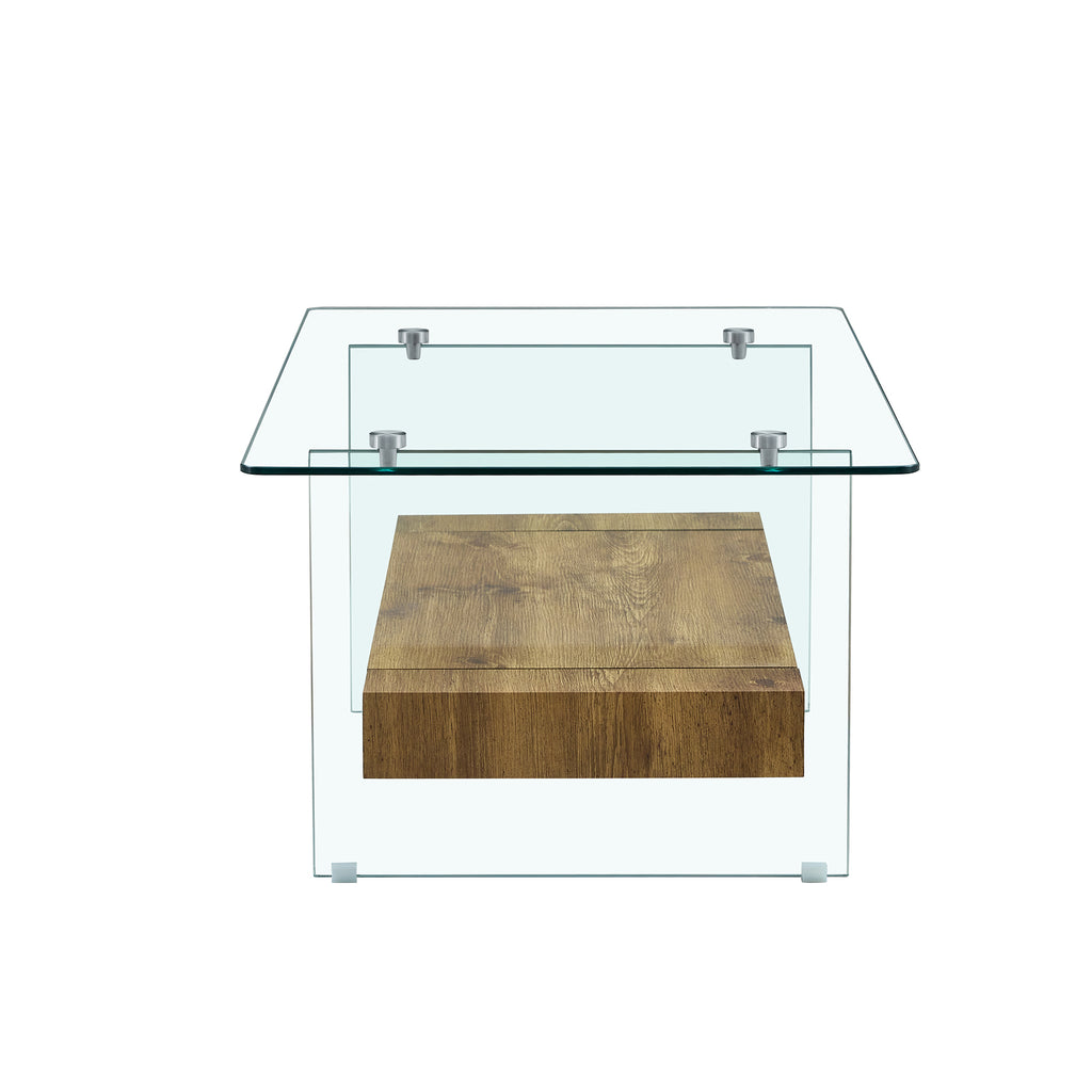 • Two-Tier Design: This coffee table features a two-tier design with a clear tempered glass top for a modern look and a lower tier with MDF covered in light wood texture sticker for added elegance.