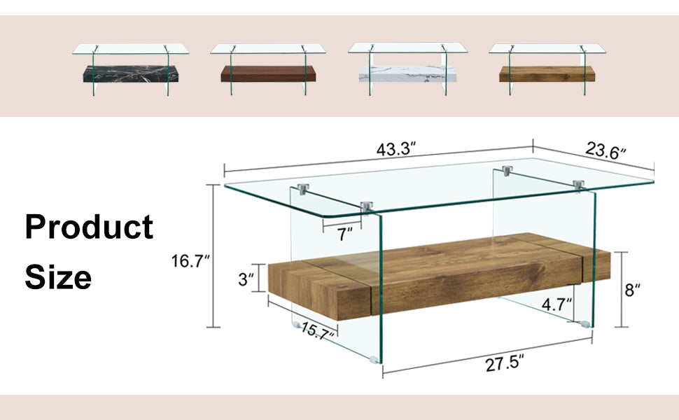 43.3 Inch Modern Two-Tier Coffee Table - An Elegant Combination of Clear Glass and Light Wood Texture Sticker.It can be used not only as a coffee table but also as a side table or display stand.
