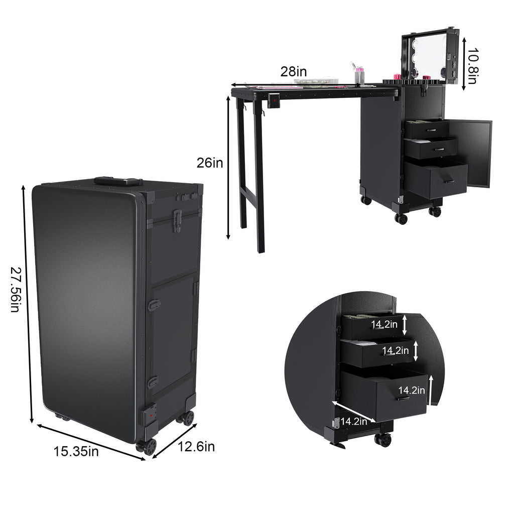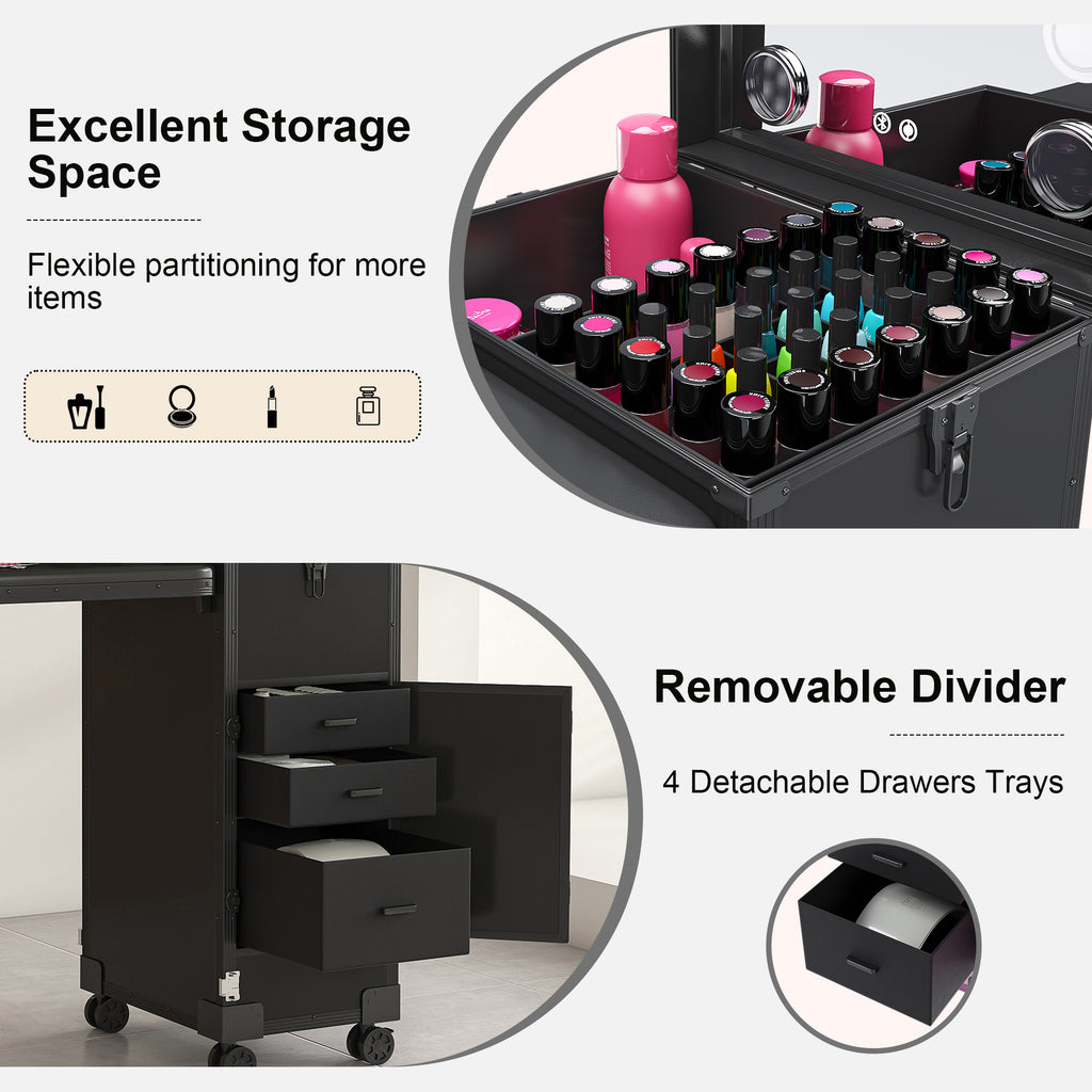 • ALL-IN-1 SALON SOLUTION – Combines a professional worktable, giant cosmetic organizer (makeup, brushes, etc.), and mobile convenience—built to last for pros and passionate DIYers.