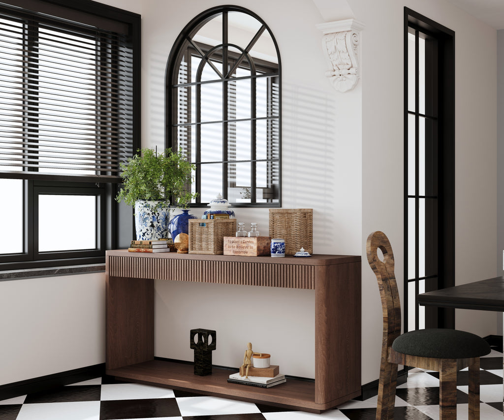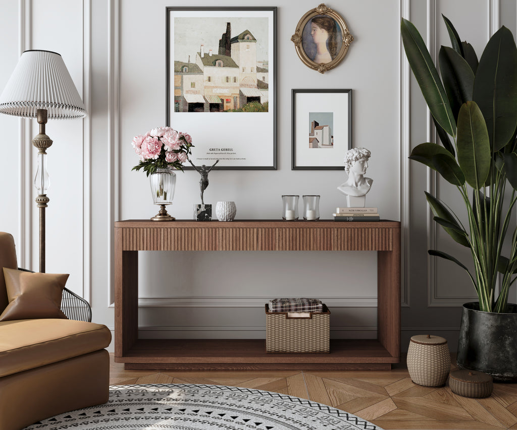 • Expansive Surface + Hidden Storage System: Double the style, triple the utility! Generous Tabletop (59.8'L x 15.7'W): Showcase lamps, art, books, or decorative collections with room to spare. Clever Under-Table Space: Slide baskets, planters, or pet beds underneath for quick-access storage that stays beautifully concealed. Two Discreet Drawers: Hide keys, remotes, or clutter behind elegant real wood slat fronts – seamlessly blending storage into design.