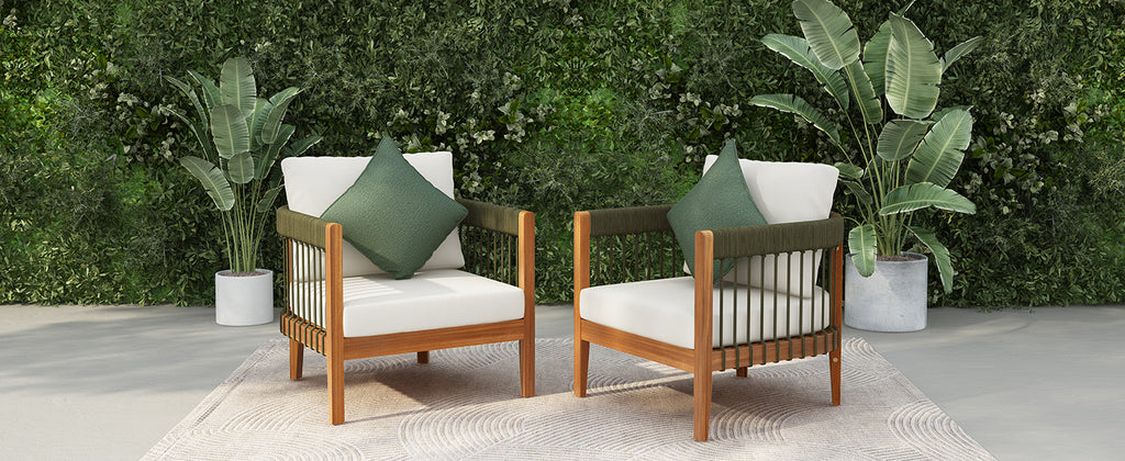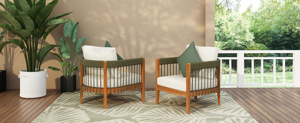 [Set of 2] Acacia Wood Outdoor Club Chair with Handwoven Rope Accents & Curved Backrest - Water-Resistant Boho Patio Lounge Chair with Removable Cushions for Porch, Garden