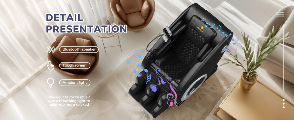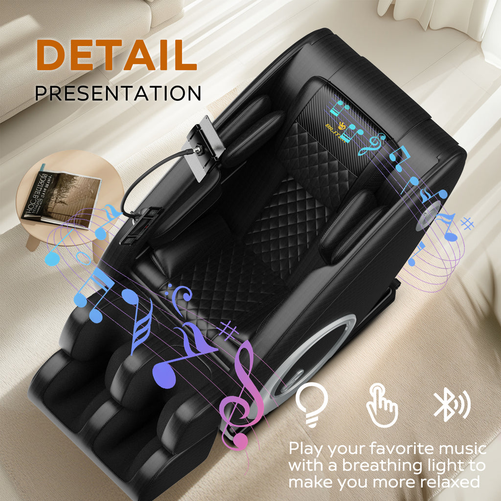 - [Humanized design] Designed with user convenience in mind, the massage chair features wheels at its base for easy mobility around the room. Integrated Bluetooth audio lets you pair your device to enjoy music seamlessly during your massage. Soft blue ambient lights along the sides create a tranquil and relaxing environment. Suitable for users weighing up to 180 pounds and standing up to 6.1 feet tall.